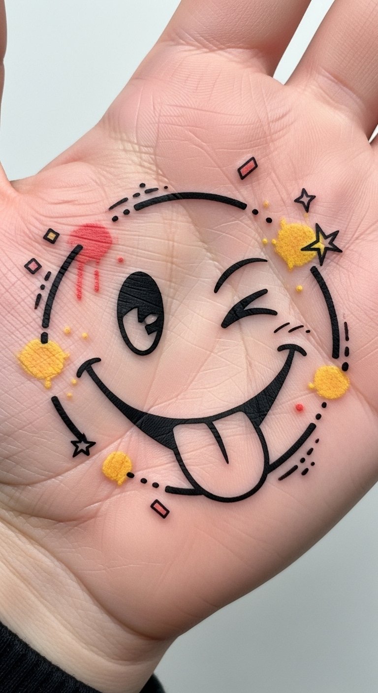 Hands and arms serve as the perfect canvas for interactive smiley tattoos, inviting engagement and playful connection.