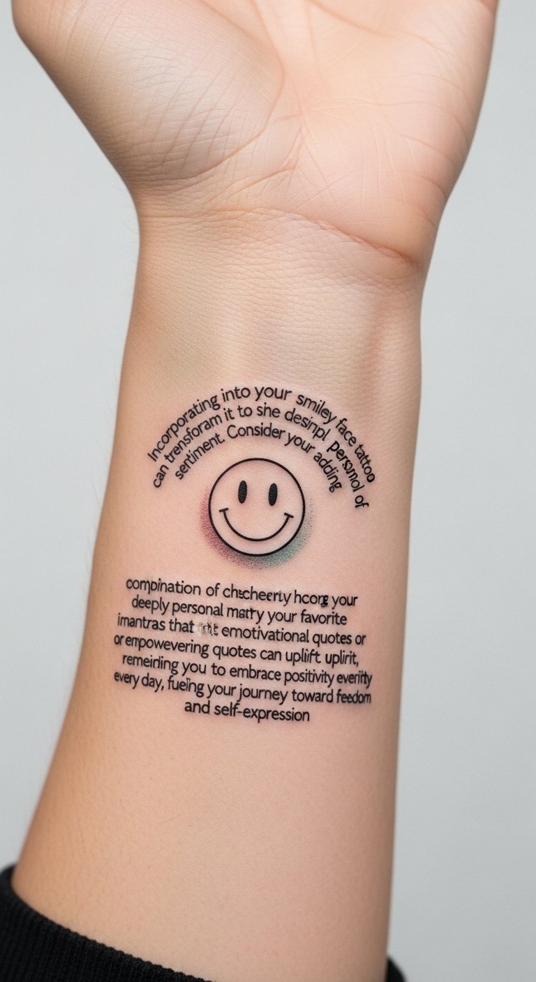 In this design, the compact smiley paired with the exact text becomes a wearable mantra that blends playfulness with intentionality; the handwritten font conveys intimacy and personal voice while the fine-line style keeps it elegant and unobtrusive. Emotionally, it serves as a gentle, constant reminder to choose joy and courage, turning daily routines into moments of affirmation. Placement on the inner wrist or forearm allows frequent visibility for self-motivation, while a behind-the-ear option offers a more private, intimate prompt for self-expression and freedom.