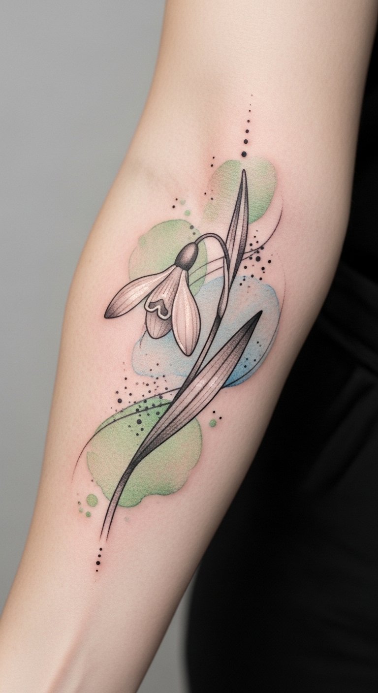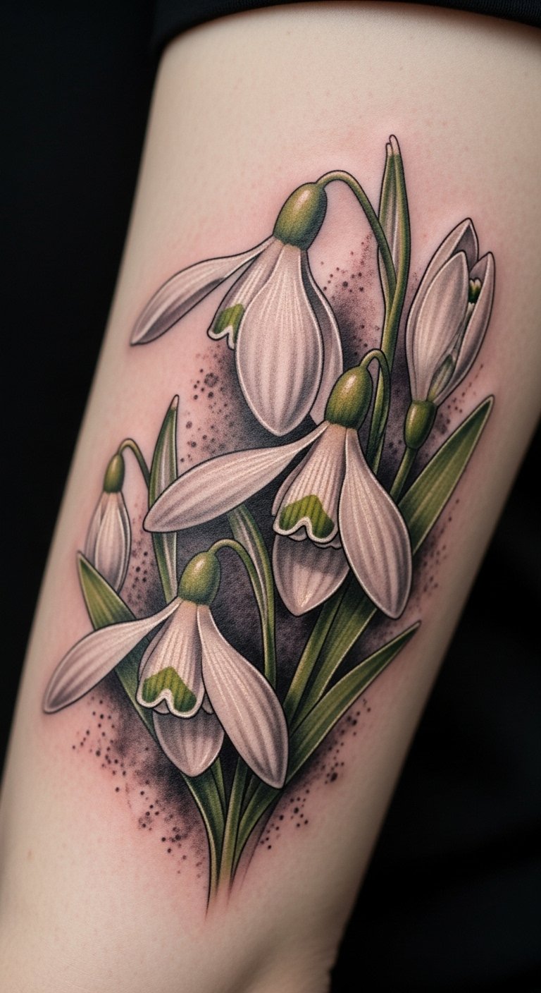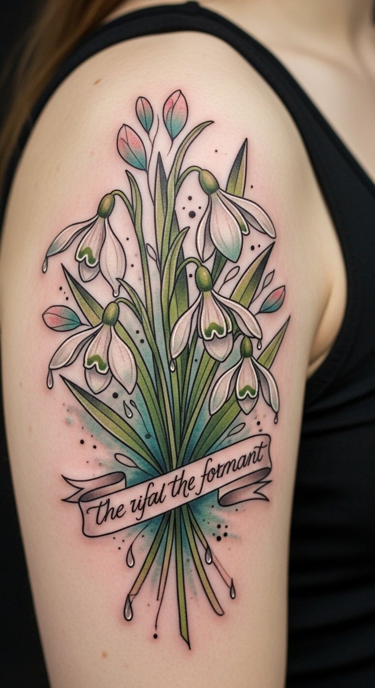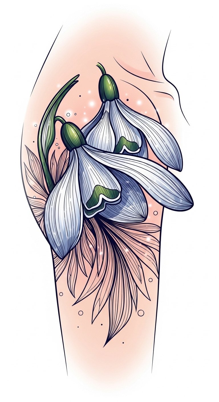 Choosing the right colors for your snowdrop tattoo can transform its meaning and impact. Imagine vibrant color palettes that burst with life, or delicate pastel shades that whisper of tranquility. Each hue tells a story—bold greens for renewal or soft whites for purity. Your tattoo can reflect your unique spirit, allowing you to embrace freedom through the art of color in your ink. The design uses lively greens and subtle whites with hints of blush and sky blue to evoke rebirth, purity, and calm; placed on the inner forearm or just below the collarbone it reads as a gentle declaration of resilience and individuality, offering both intimate emotion and visible symbolism.