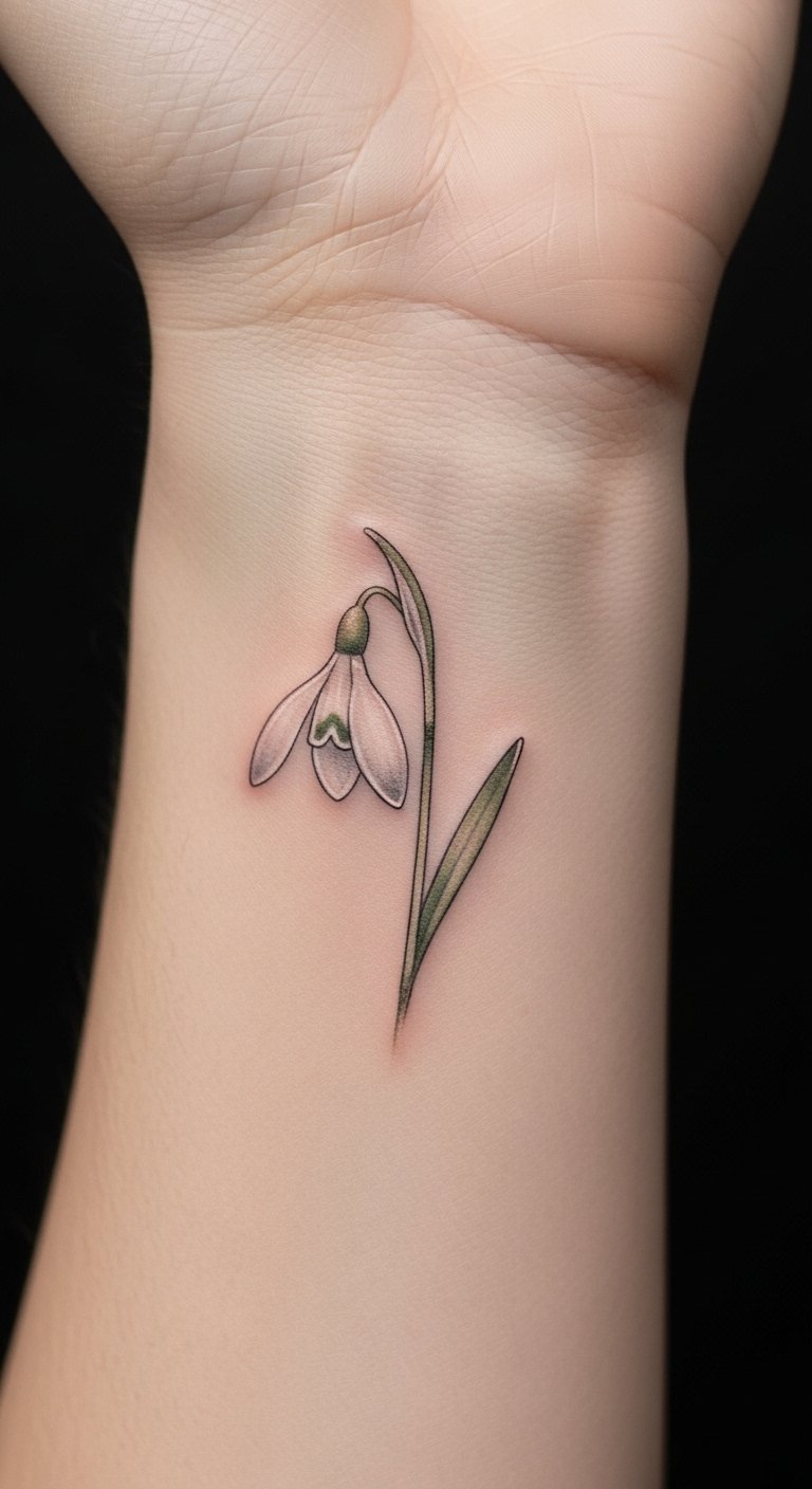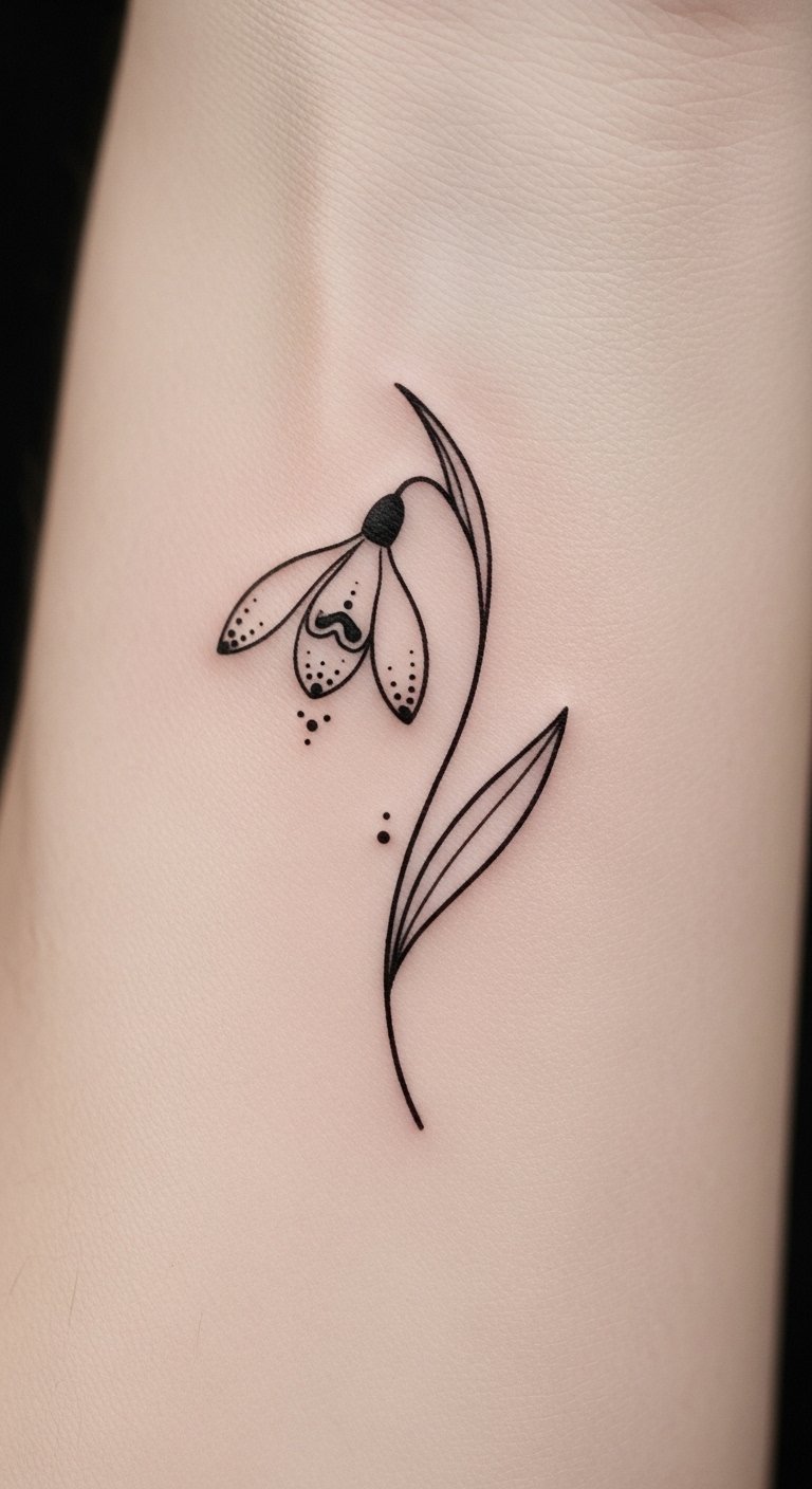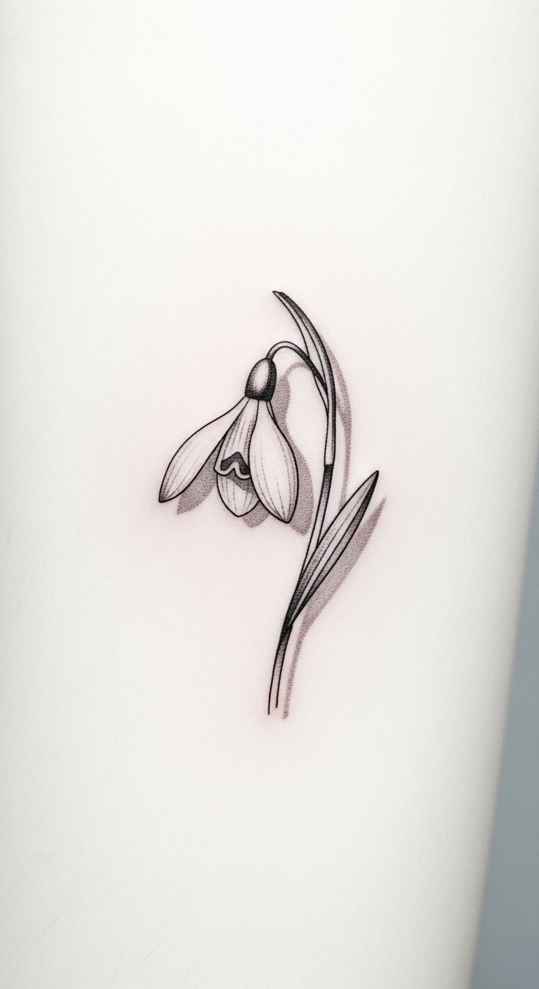 As you consider this snowdrop tattoo concept, think of the tiny bloom as a quiet emblem of renewal and gentle resilience; placed on the wrist, ankle, or behind the ear it reads intimate and personal, a subtle reminder of hope, while expanded across the thigh or along the back it becomes more expressive and graceful, following natural lines to emphasize movement and feminine form.
