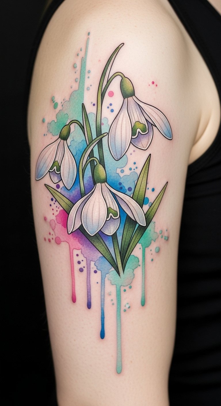 Embodying hope and renewal, this design blends vibrant watercolor hues with intricate blackwork to capture resilience and fragile beauty; its gentle drooping blooms evoke quiet endurance and the paint droplets suggest emergence from thawing winter—ideal for visible, intimate placements like the forearm, wrist, or behind the ear where the emotional reminder of life’s enduring possibilities can be both personal and seen by others.