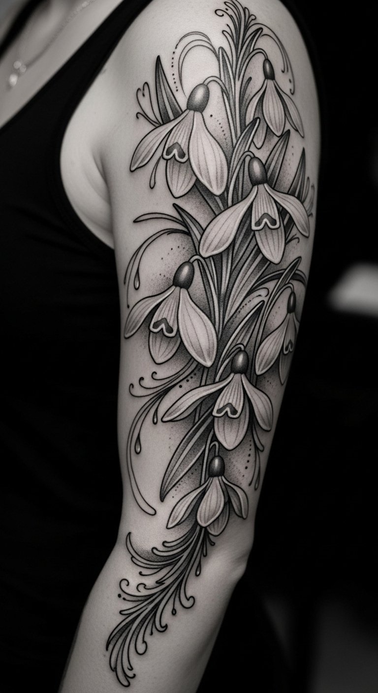 Building on the striking elegance of monochrome snowdrop ink, consider the enchanting possibilities of a full sleeve design that showcases these delicate flowers in all their glory.