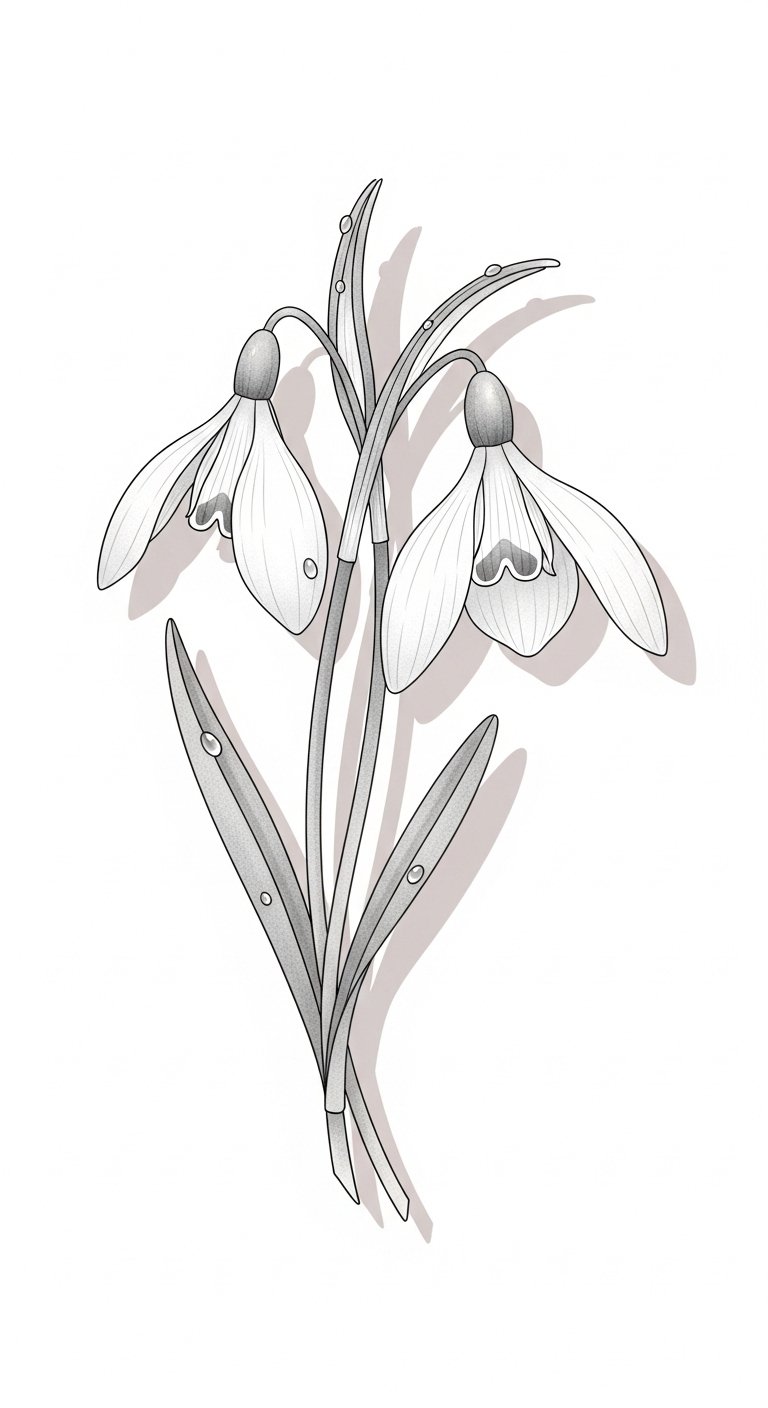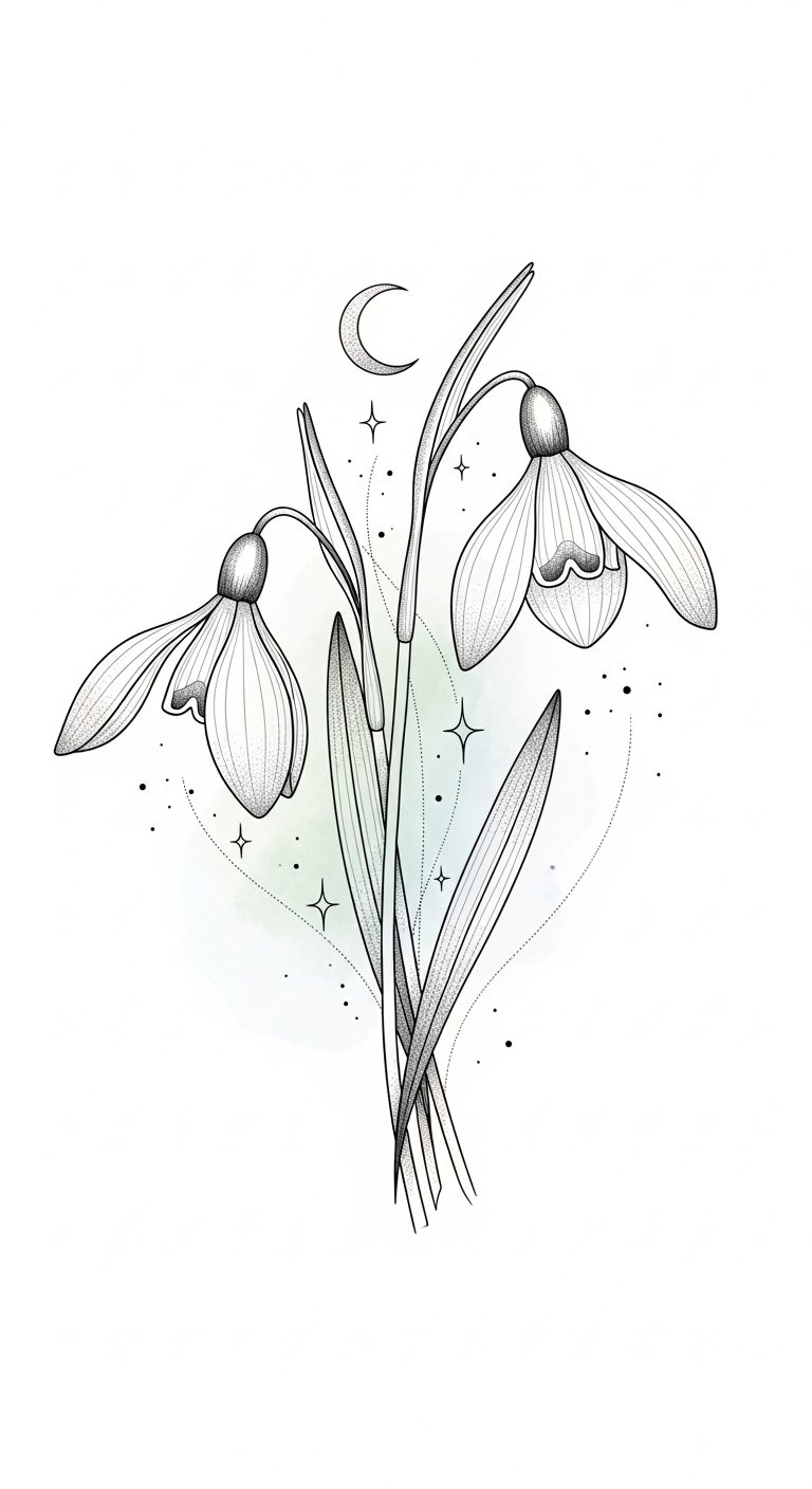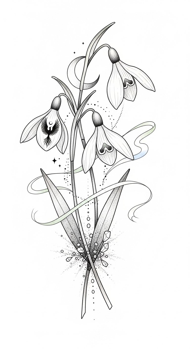 Embrace the artistry of a snowdrop tattoo and express your unique connection to nature. This design symbolizes purity, resilience, and quiet renewal; the soft, downward-facing blooms convey gentle protection and hope after hardship.
