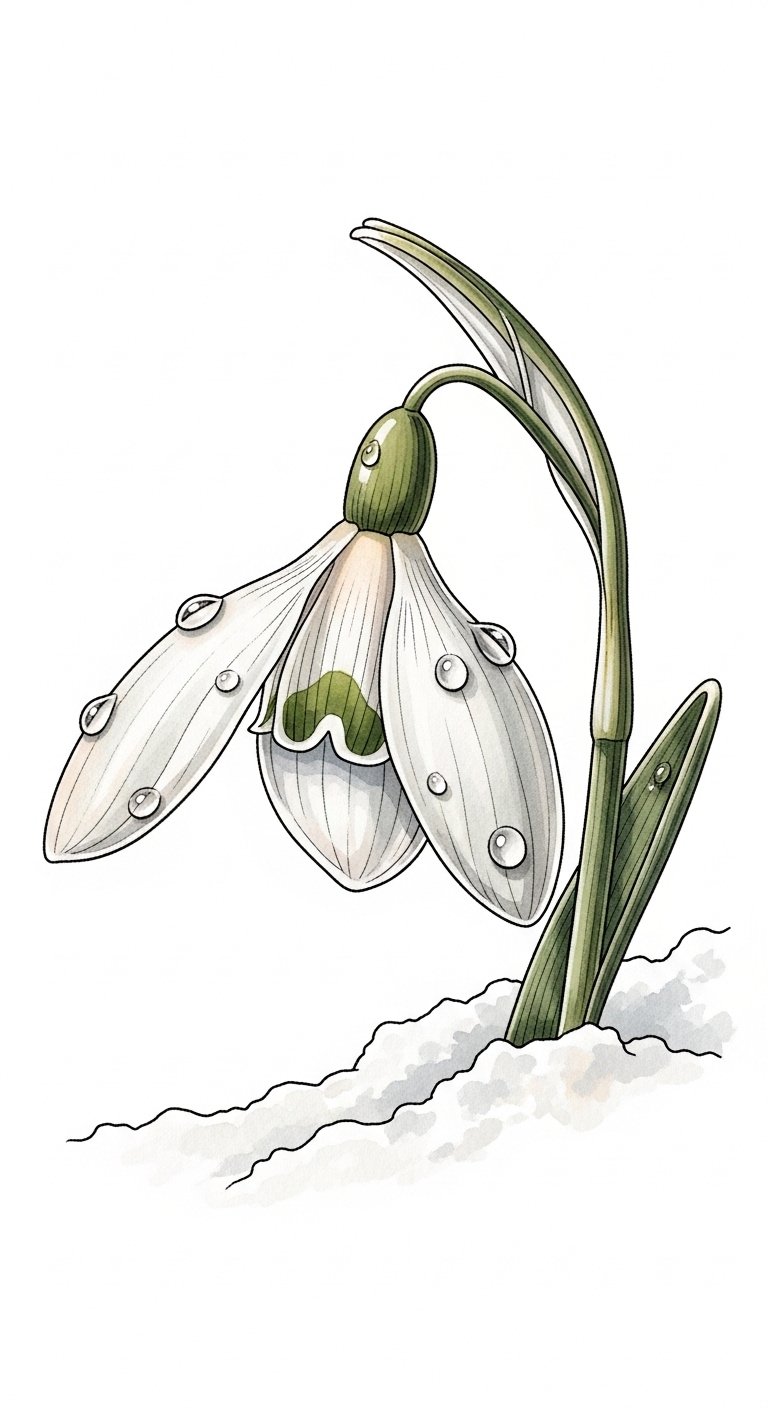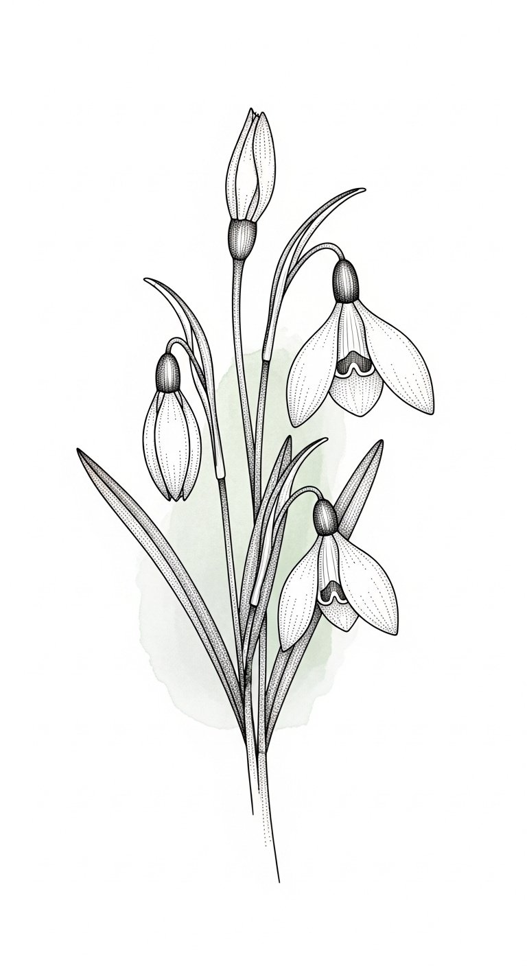 This design concept centers on a minimalist snowdrop cluster rendered with fine linework and watercolor washes—muted greens, pearly whites, and a hint of blush—to evoke softness and renewal.