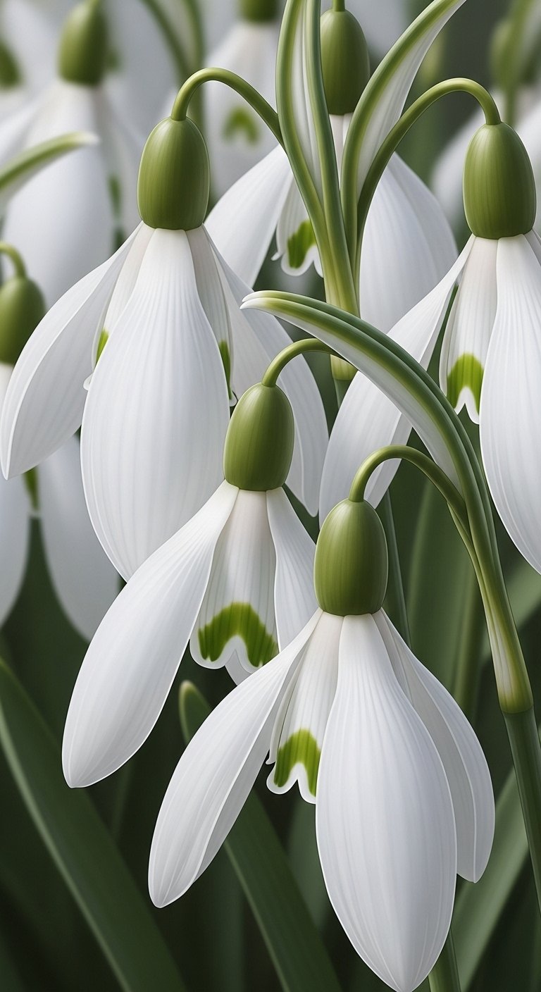 The green stem symbolism represents growth and renewal, beautifully complementing the delicate snowdrop color variations.