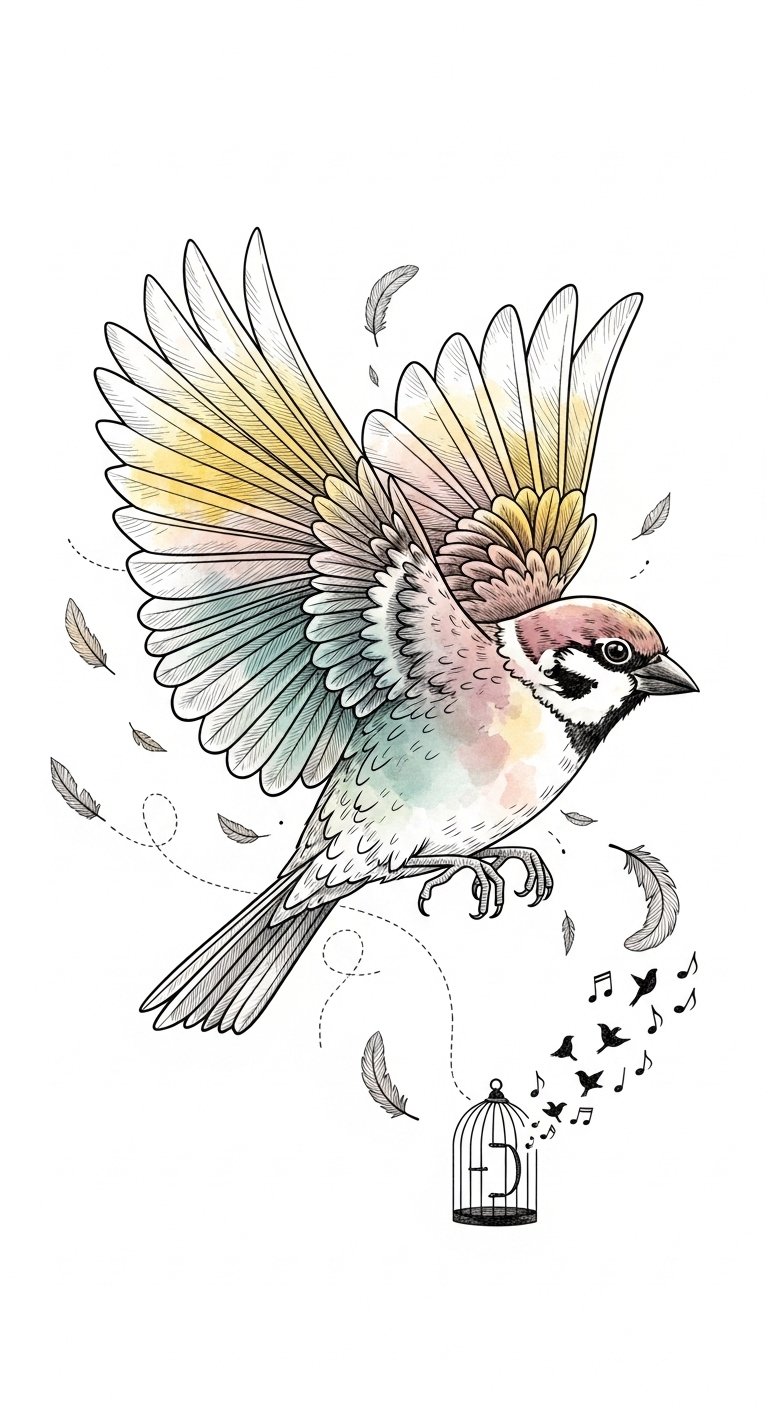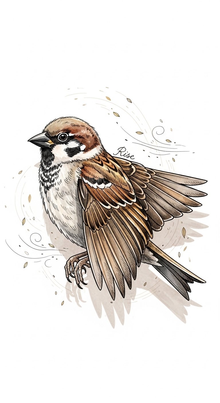 Let the sparrow inspire you to soar above limitations and embrace your true self. This design symbolizes quiet resilience and personal growth; the ruffled feathers and motion suggest weathered experience, the warm watercolor tones convey comfort and healing, the seed motifs represent small victories, and the hidden script offers a private mantra.