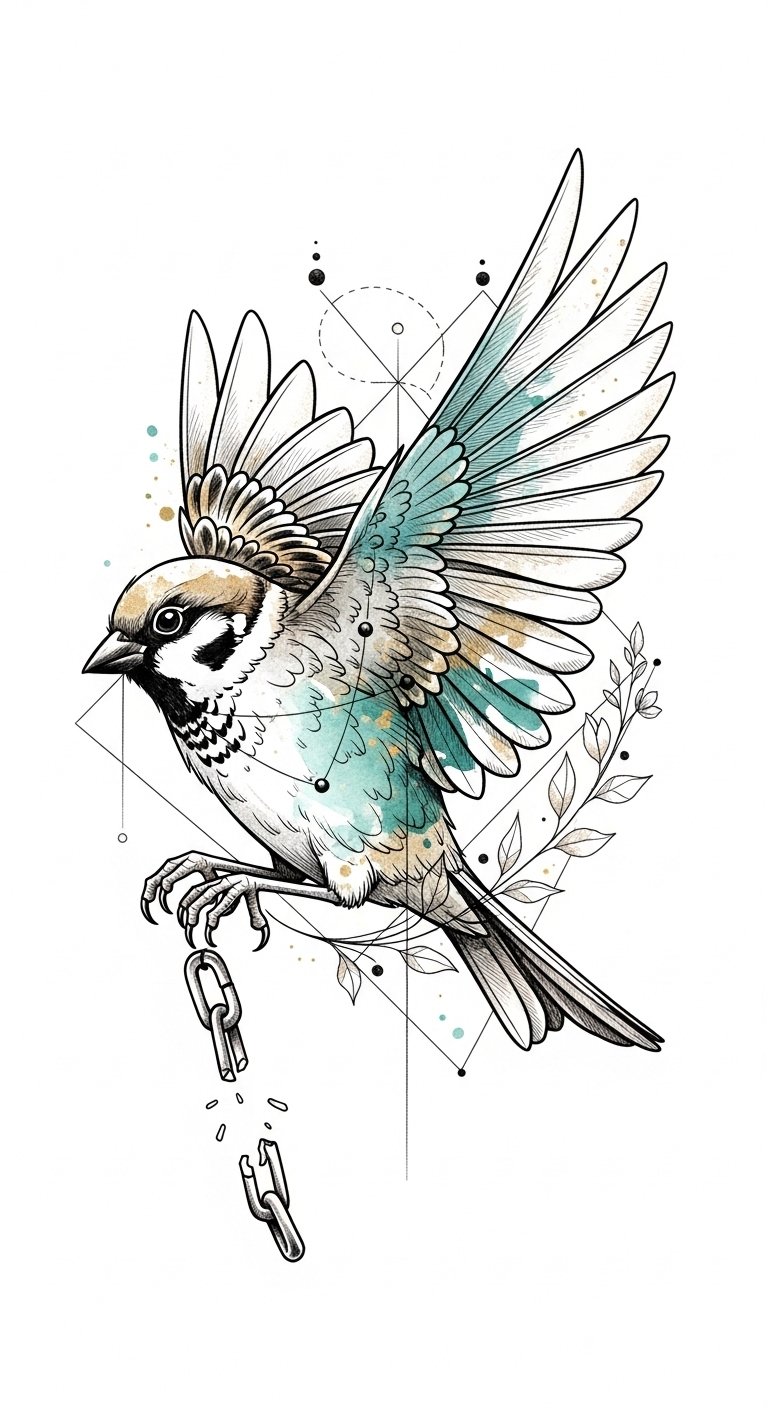 This design pairs the sparrow’s motion with symbolic elements—the broken chains for liberation, vines for growth, and watercolor tones for emotional depth—evoking strength and hope; ideal placements include the inner forearm, shoulder blade, or upper chest where the sparrow’s flight can follow the body’s natural lines and be shown or concealed as desired.