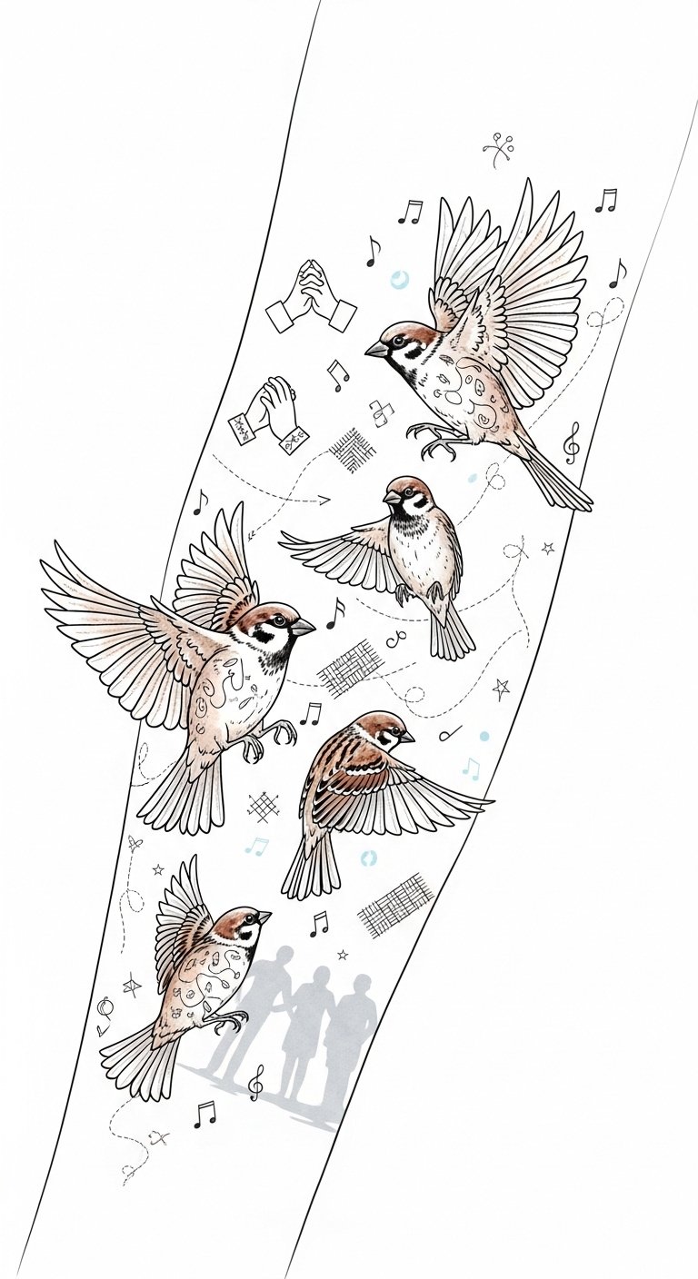 At tattoo gatherings, cultural expressions flourish, showcasing artistic collaborations that strengthen collective identity. Each sparrow inked on your skin represents the bonds that unite us in our quest for freedom. The design symbolizes unity and mutual support—sparrows as carriers of shared stories, the clasping hands and woven threads emphasizing human connection, musical notes evoking joyful gatherings; emotionally it feels warm, grounding, and empowering.