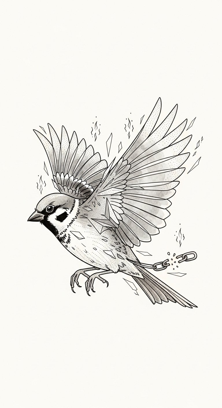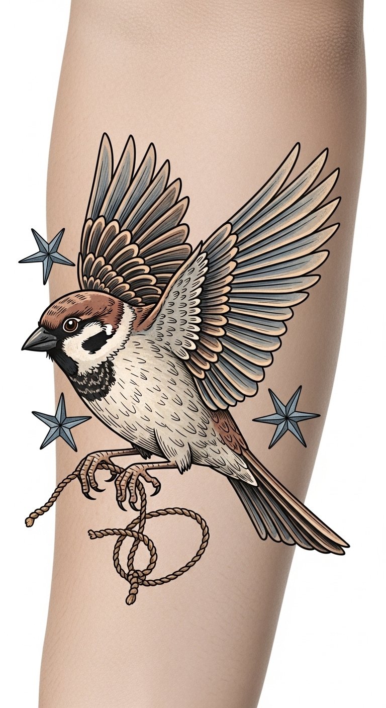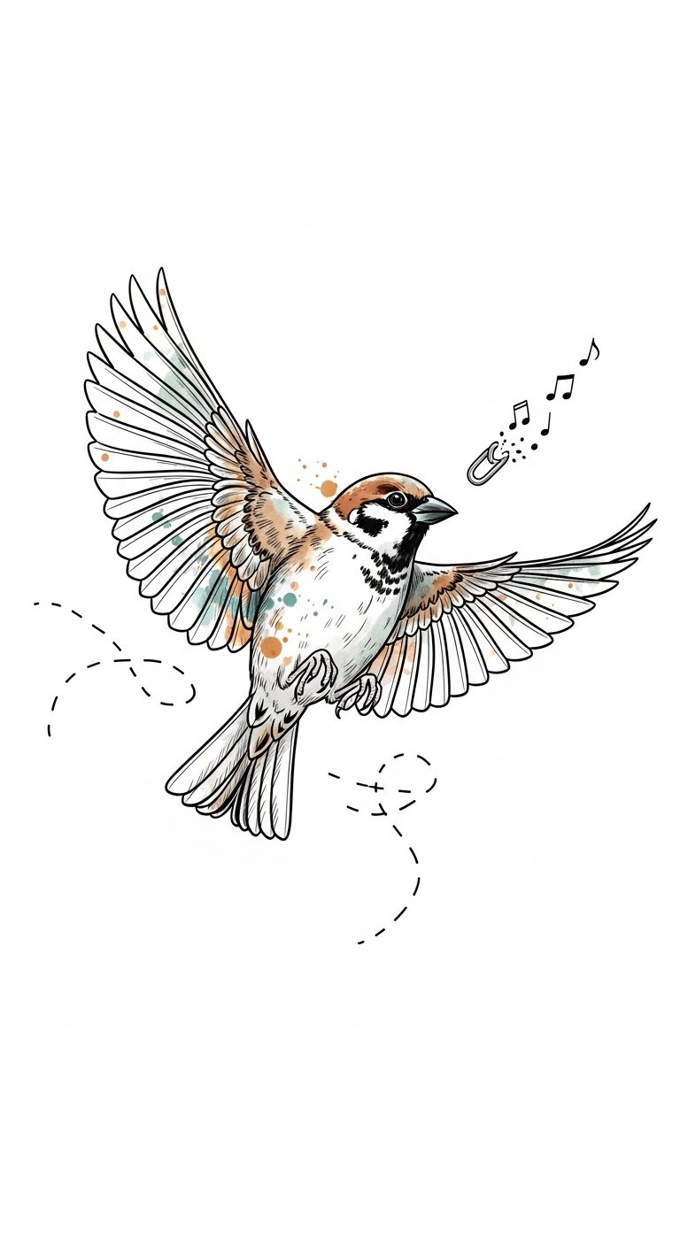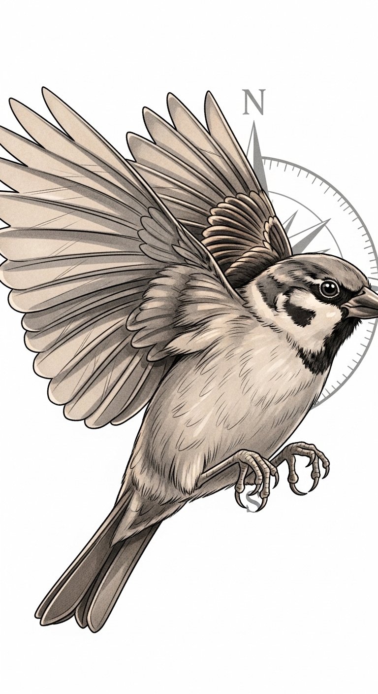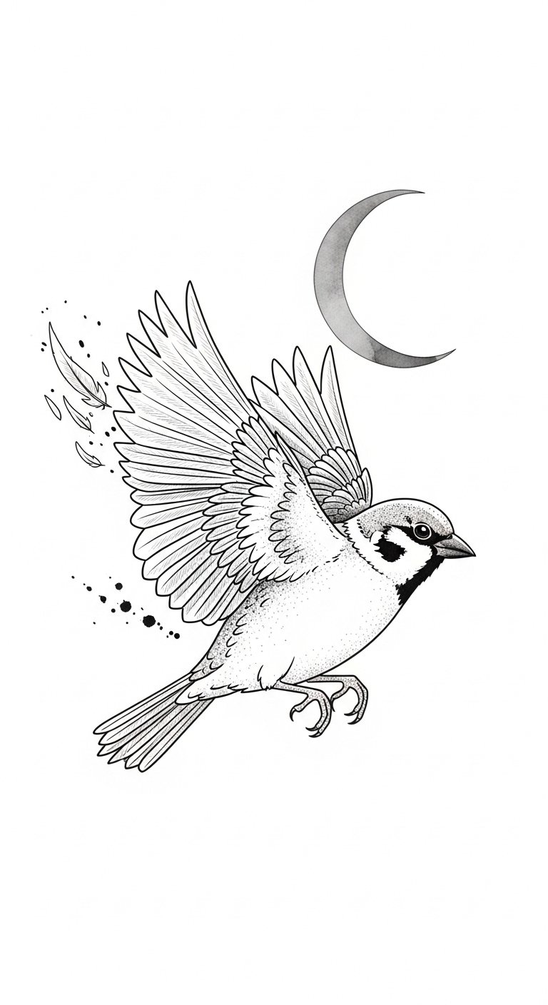 Ideal placements: outer forearm or upper shoulder where the sparrow’s flight follows the body’s natural lines, visible yet intimate, allowing the wearer to feel empowered each time they see it.