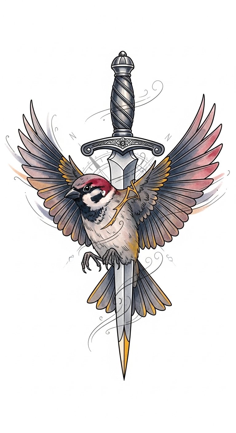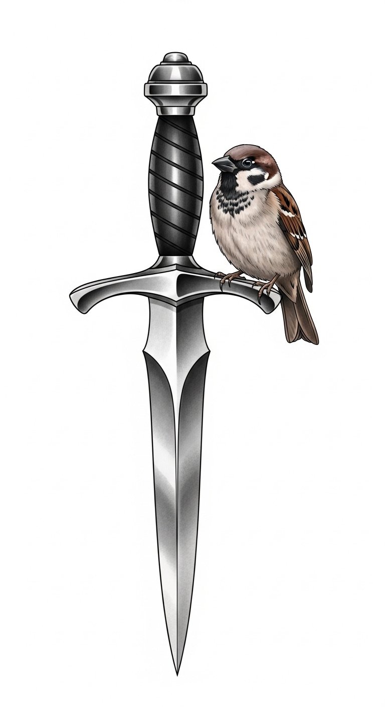 The dagger’s sharp edge signifies strength, while the sparrow’s flight embodies resilience, making this combination truly inspiring. Place the design along the forearm for a linear, storytelling effect or over the upper chest so the sparrow’s wings follow the collarbone—intended to evoke protective resolve, bittersweet bravery, and quiet defiance.