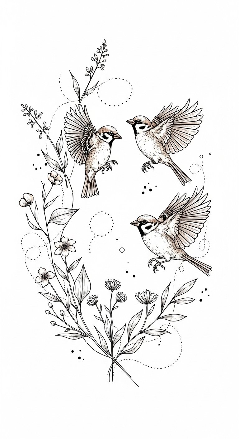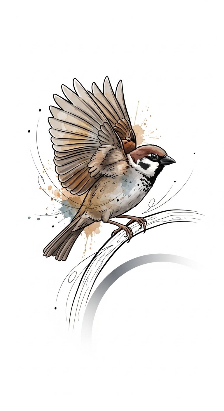 This design evokes gentle resilience and joyful curiosity; place it on the forearm, shoulder blade, or ribcage where the sparrow’s gaze can follow movement, enhancing personal symbolism of freedom, memory, and the celebration of small wonders.