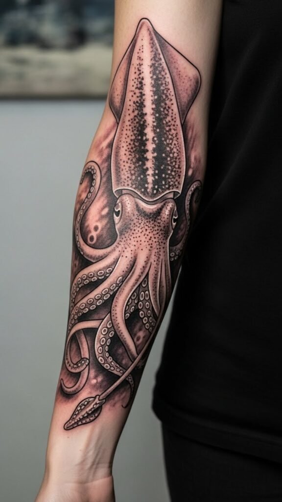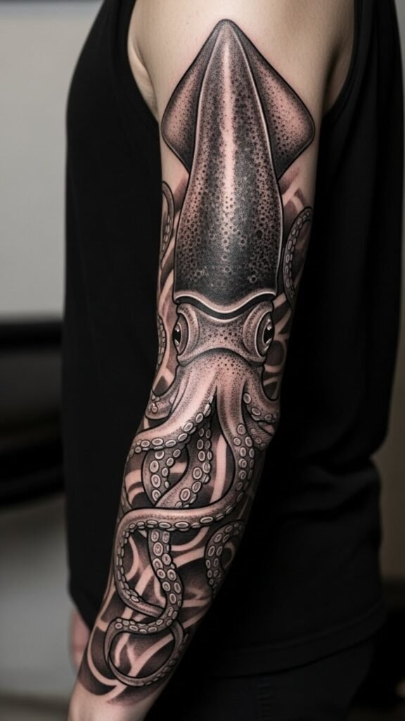 The imagery symbolizes adaptability, intelligence, and the hidden depths of the self; placed as a full or half sleeve on the arm it follows muscle contours to emphasize movement, the tentacles wrapping around the forearm, bicep and shoulder to evoke flow and transformation while retaining a moody, contemplative emotional tone.