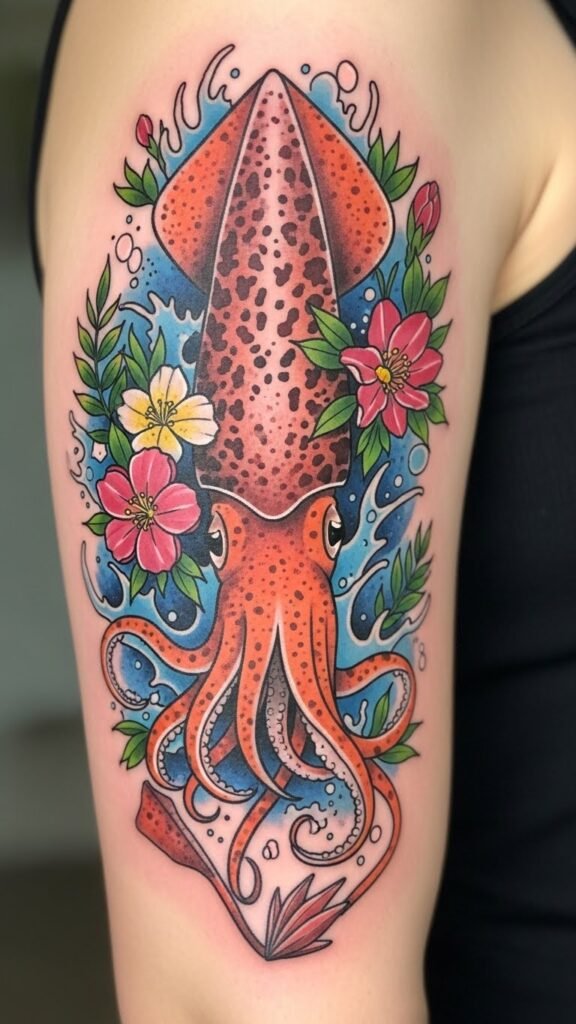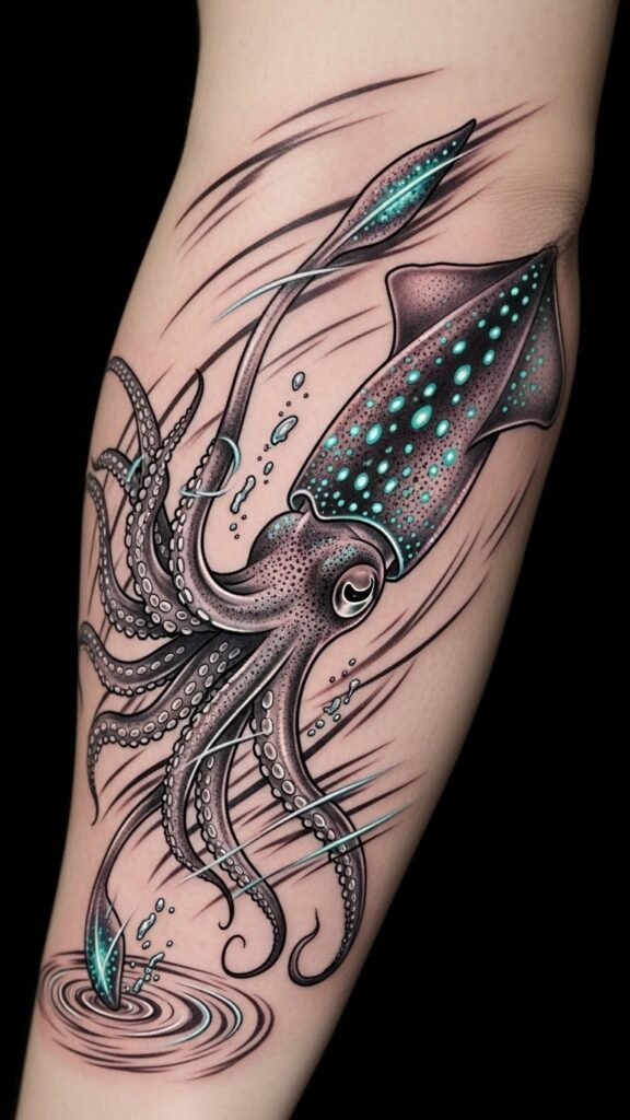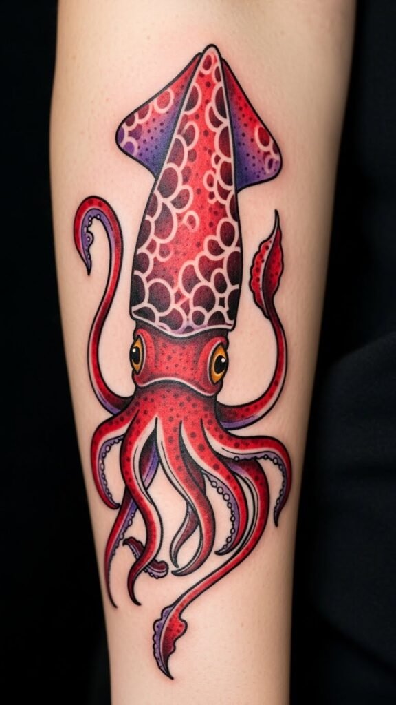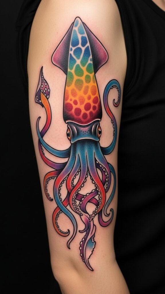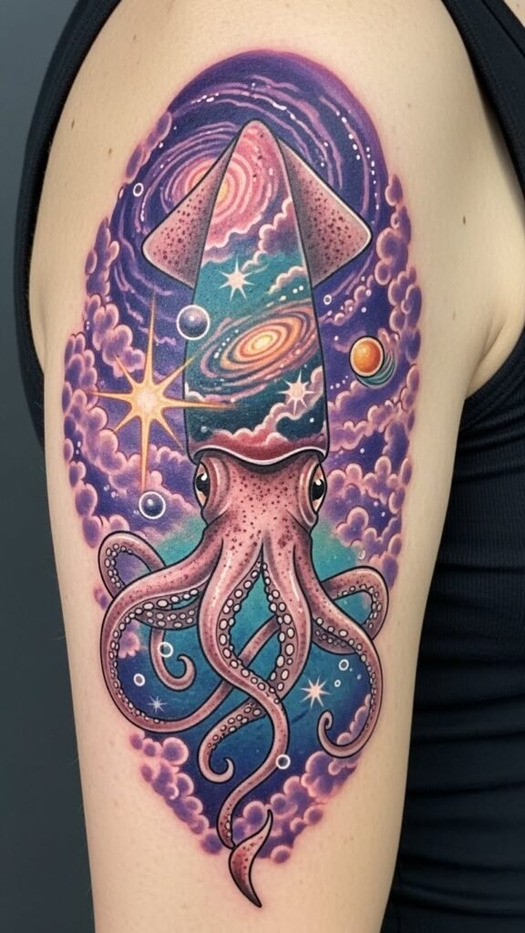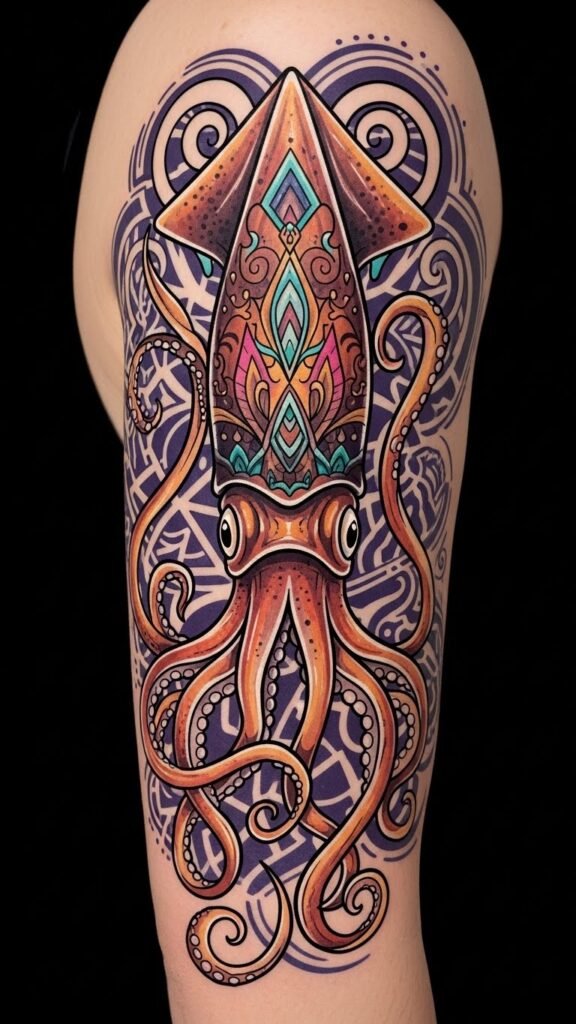 This design symbolizes adaptability, mystery, and creative transformation—colors and fluid forms evoke curiosity and emotional depth, while the squid’s flowing tentacles suggest movement and resilience; placed along the forearm the composition reads dynamically in motion, along the upper back it becomes a larger statement piece that follows shoulder contours, and scaled to the ribcage it offers intimate, private meaning—use soft shading near skin folds to enhance natural flow and choose placement based on visibility and personal resonance.