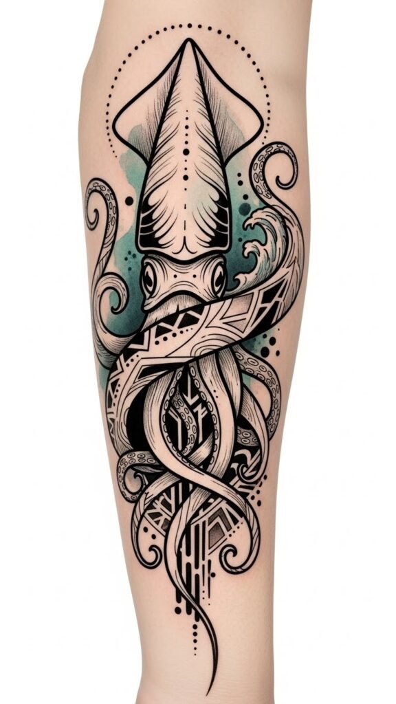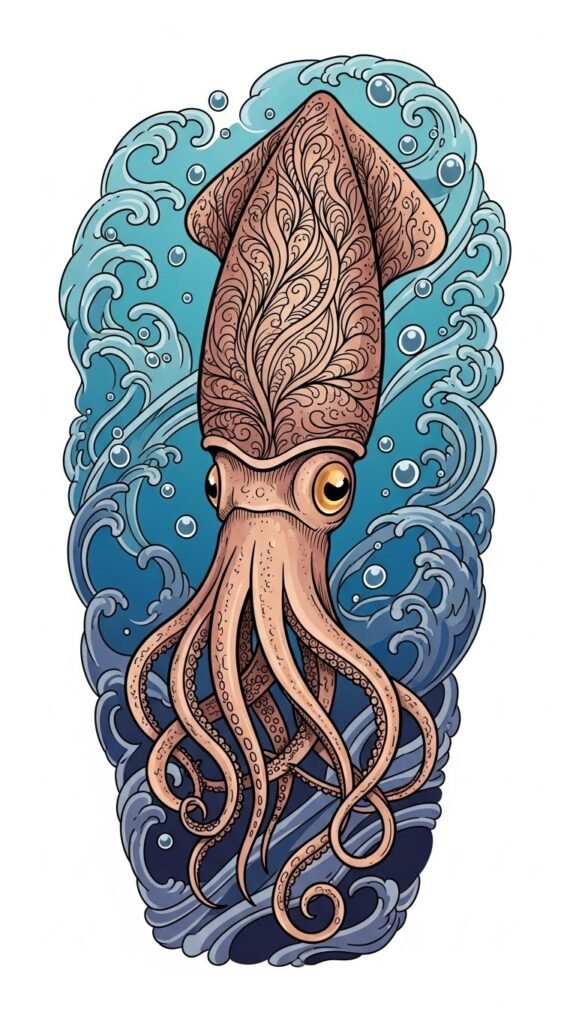 This tattoo concept uses the squid as a focal symbol of mystery, adaptability, and resilience, with surrounding oceanic elements and swirling color transitions that suggest healing and transformation; emotionally it evokes calm curiosity and a bold embrace of personal change, making it suited for a forearm sleeve, upper arm wrap, or full back piece where flowing tentacles can follow the body’s contours and movement.