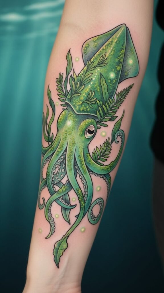 Shifting from the whimsical charm of playful squids, nature-inspired squid tattoos in vibrant green hues evoke a sense of tranquility and connection to the earth.