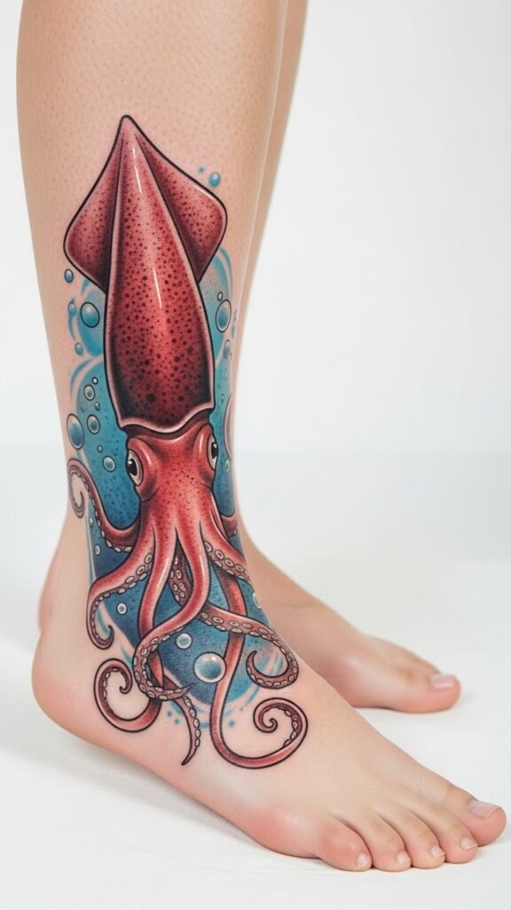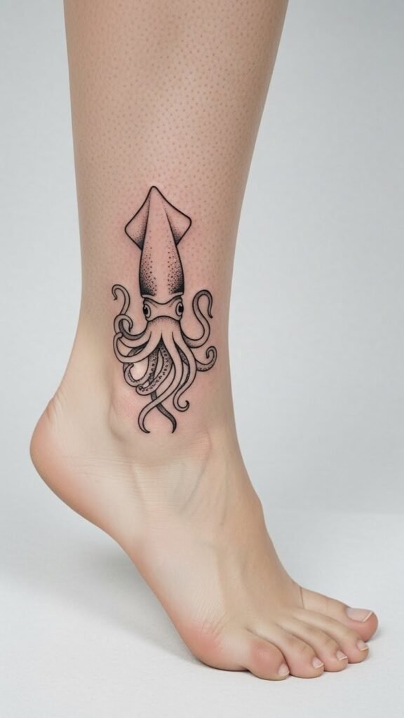 Symbolically, the squid represents adaptability, intelligence, and creative resourcefulness, while the ankle placement conveys subtlety and personal significance—visible when chosen yet intimate—invoking feelings of quiet confidence, fluid transformation, and a connection to the sea.
