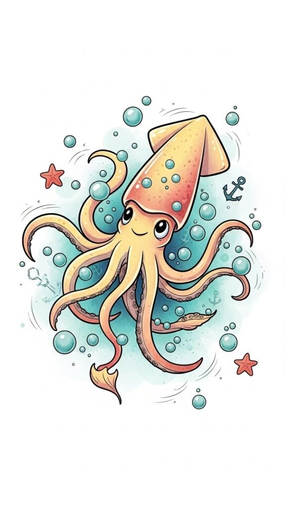 After exploring the enchanting fusion of squid and nautical elements, it’s time to embrace a lighter, more playful side with whimsical squid designs.