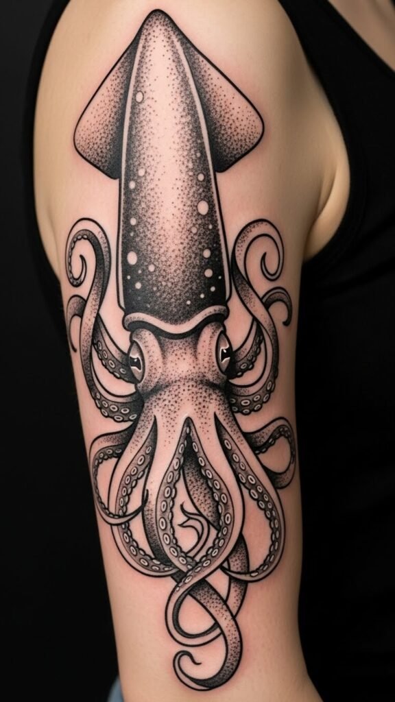 Using advanced ink techniques, the design flows seamlessly around your arm, showcasing the squid’s mesmerizing tentacles.