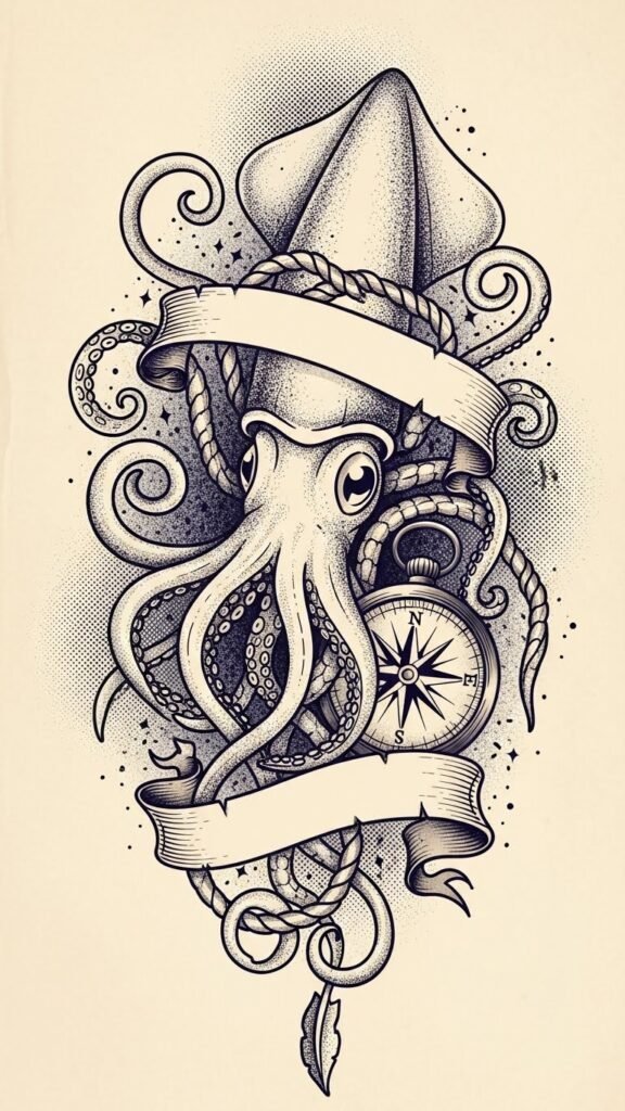 Imagine intricate designs featuring squid intertwined with anchors, compasses, or ship wheels, each symbolizing freedom and exploration. This stunning combination captures squid symbolism and nautical mythology, celebrating the spirit of the sea and your adventurous soul.