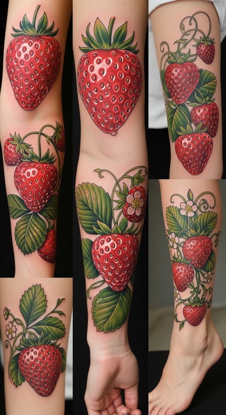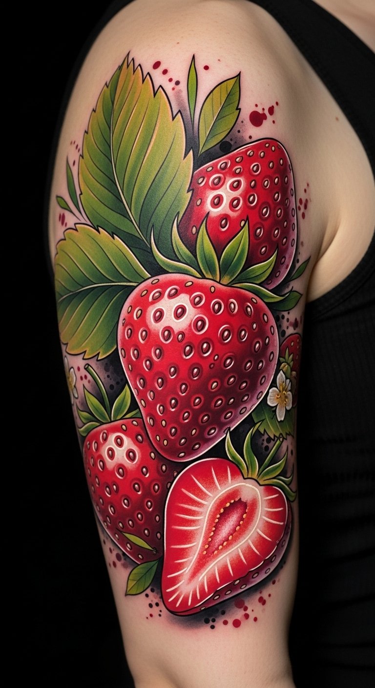 This vibrant color symbolism captures passion and growth, reflecting seasonal strawberry meanings. The rich reds and lush greens create a striking contrast, making your tattoo a dynamic expression of freedom and nature’s beauty.