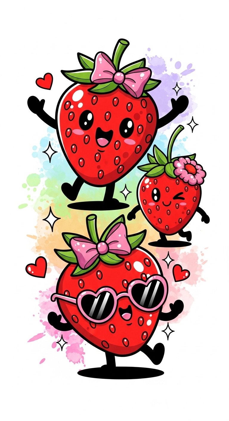 Picture vibrant, cartoonish characters adorned with playful expressions, bursting with personality. These delightful designs capture the essence of fun and freedom, allowing your unique style to shine. Embrace the charm of strawberries reimagined in a lighthearted, artistic way that truly stands out!