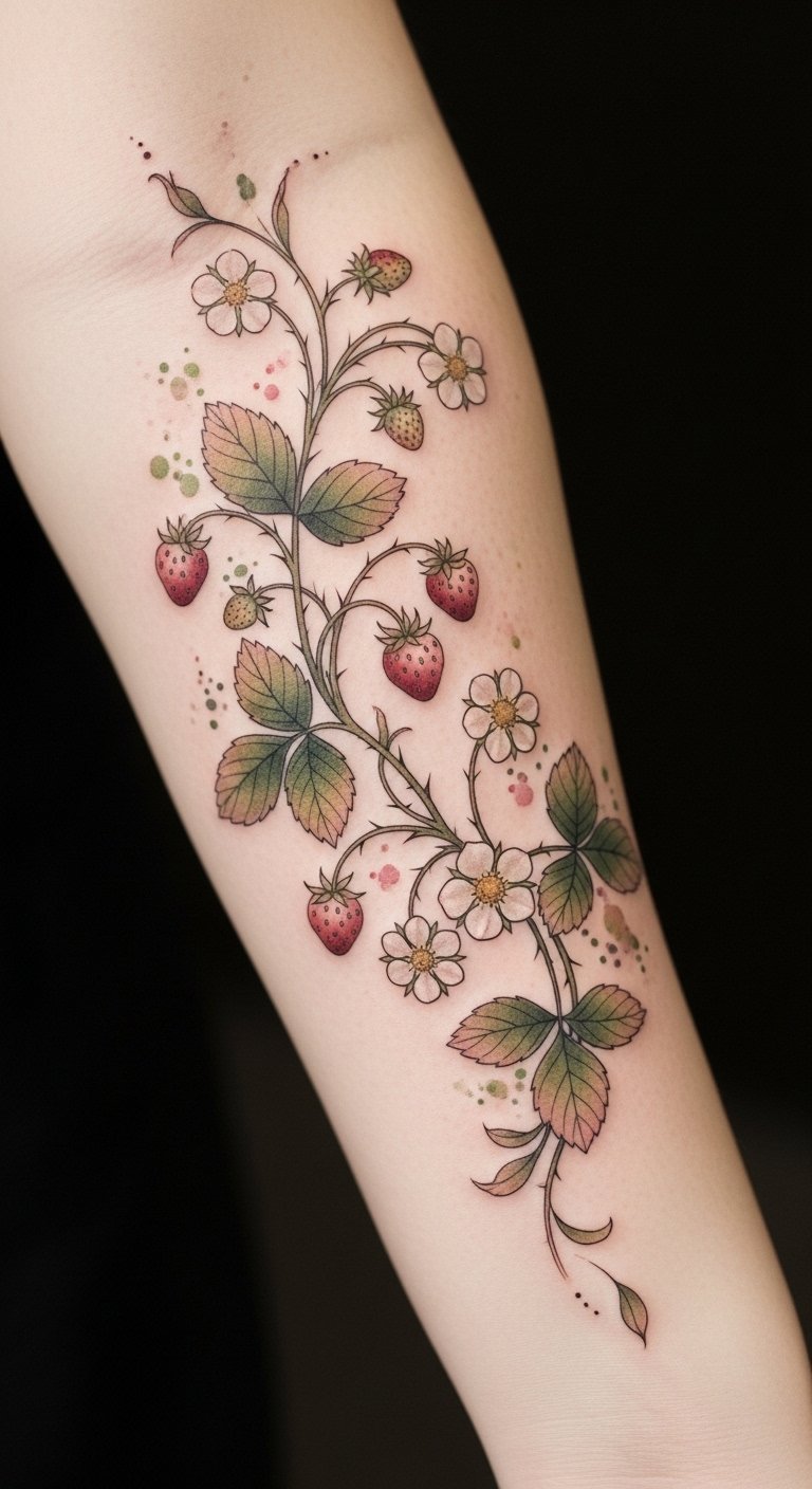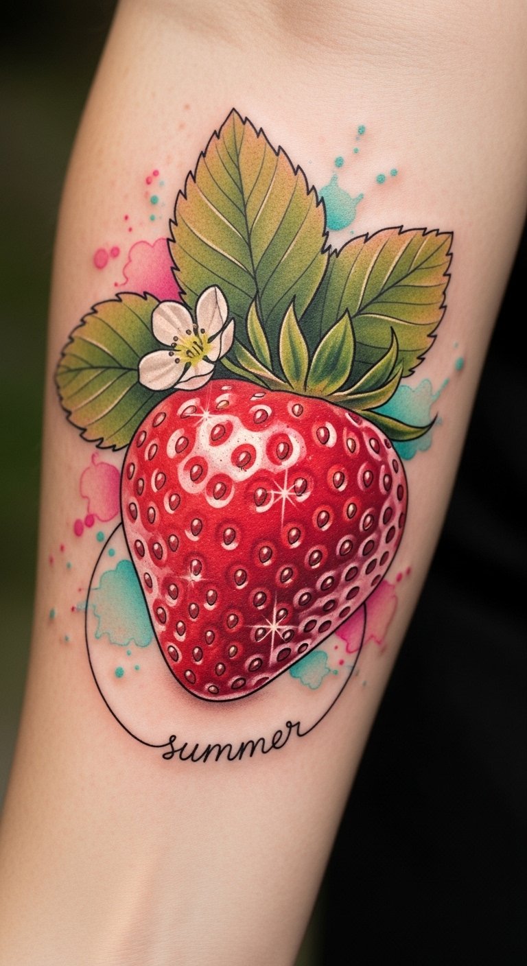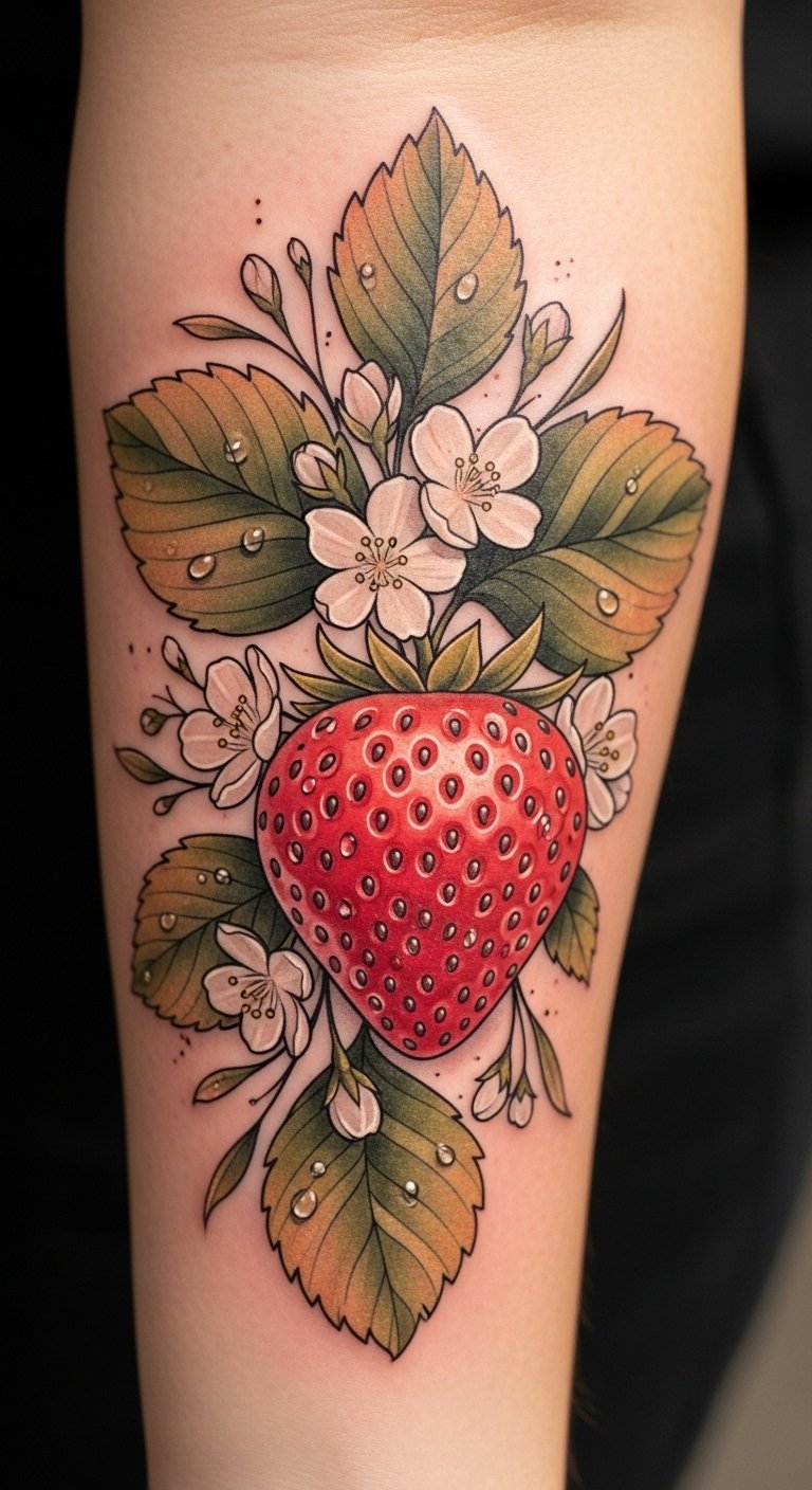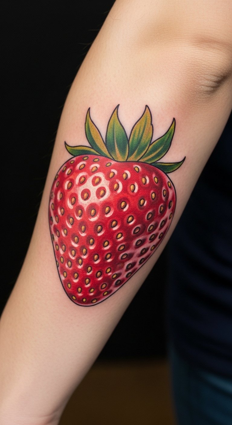 Forearm strawberry ink symbolizes sweetness, growth, and the celebration of individuality; its bright colors evoke joy and warmth while intricate seeds and leaf details suggest the complexity of personal narratives.