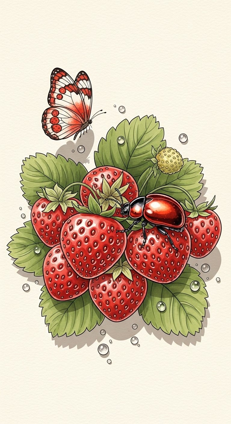 This design uses strawberries as symbols of youth, abundance, and sensual delight; their playful movement conveys spontaneity and a carefree spirit.