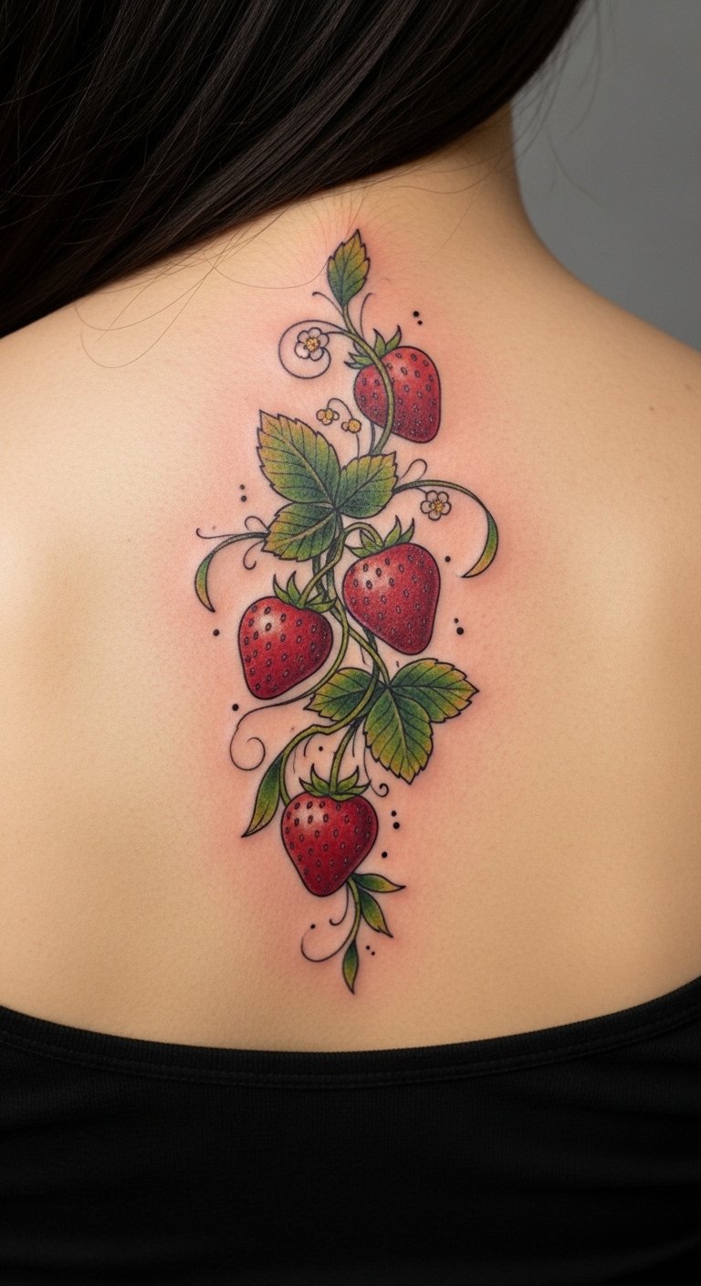 Upper back strawberry tattoos placed along the shoulders and spine evoke warmth, sensuality, and a sense of renewal; the strawberries represent sweetness and desire while the delicate vines suggest connection, resilience, and personal growth.
