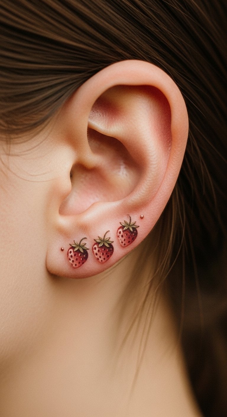 When you choose to adorn the area behind your ear with strawberry art, you’re not just opting for a tattoo; you’re embracing a playful yet sophisticated statement. This discreet tattoo placement allows for personal expression, visible only when you want it to be. The delicate design of tiny strawberries adds charm, inviting curiosity while radiating a sense of freedom and creativity in your style.