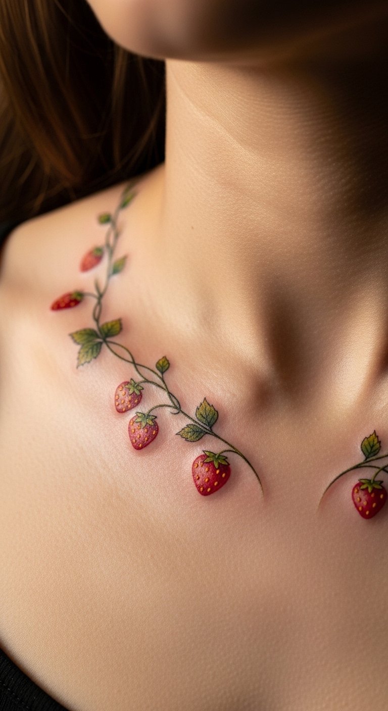 This concept blends playful sweetness and refined elegance: small, bright strawberries clustered along a gently curving vine that follows the collarbone’s natural line, with fine-line leaves and tiny seed accents for texture.