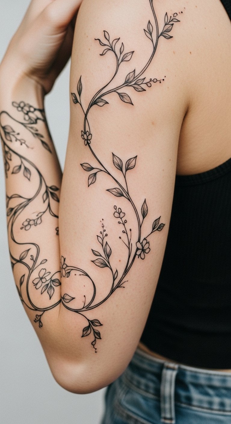 Ideal placements include the outer forearm, upper arm wrap, or shoulder blade where the spiral vine can follow natural contours and maintain visual flow.