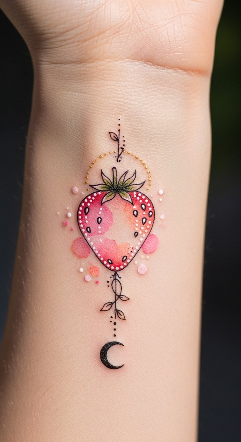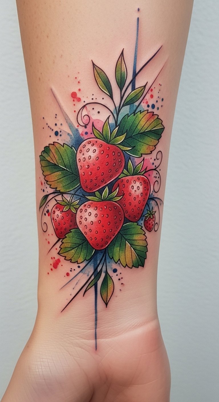 The design concept uses the original text as a visual and thematic guide: a small wrist or ankle tattoo rendered in loose watercolor washes of saturated red and fresh green, with a minimalistic strawberry silhouette overlaid in fine black linework. Symbolically it represents sweetness, vitality, and playful individuality; emotionally it reads as joyful and confident, a private emblem that invites smiles. Placement on the wrist or ankle allows casual visibility or concealment, making it a versatile personal statement that complements everyday movement and draws the eye with fluid color and simple form.