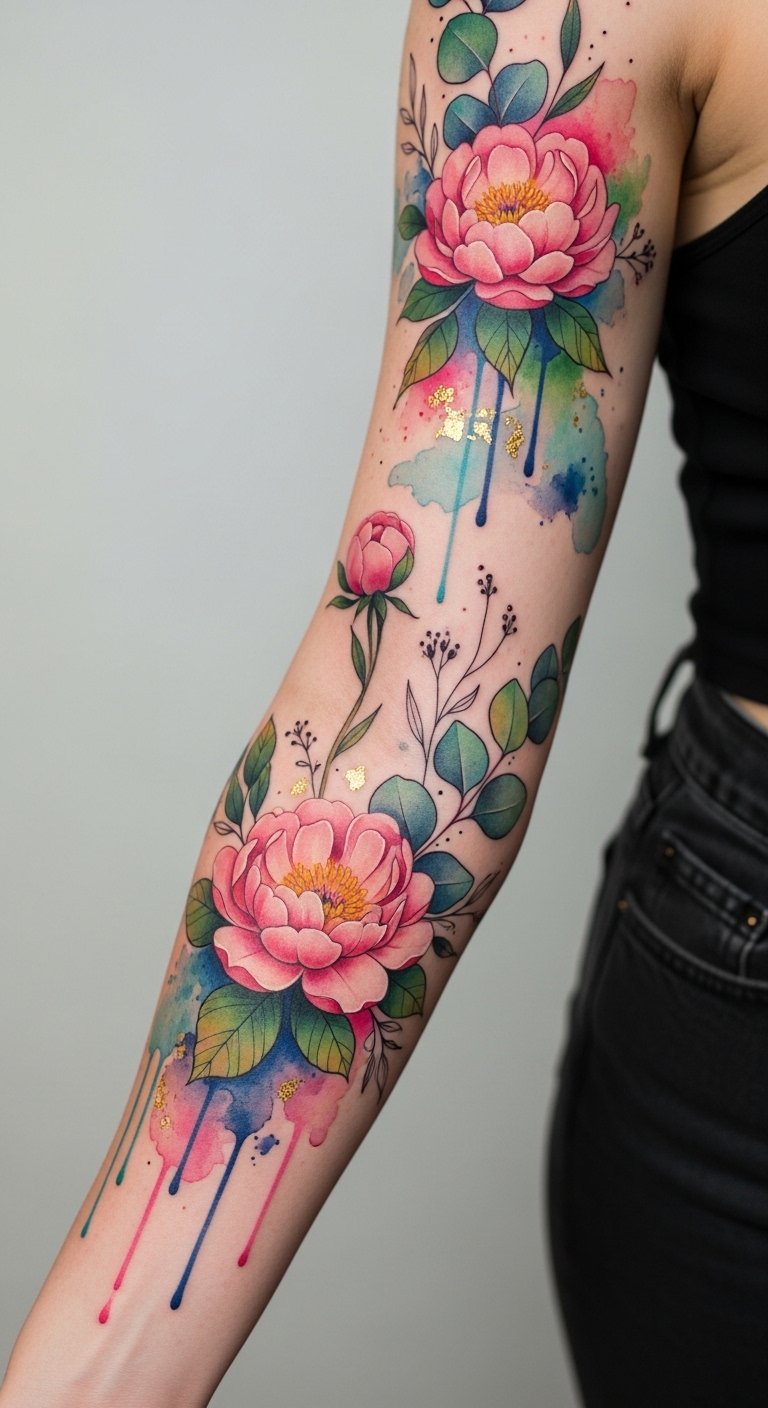 This sleeve symbolizes growth, resilience, and feminine strength—peonies for prosperity and healing, wild roses for passion, eucalyptus for protection—evoking a sense of liberation and joyful self-expression; ideal placement is a full-arm wrap to emphasize movement and flow, or scaled to a shoulder-to-forearm piece to frame the wearer’s gestures and energy.