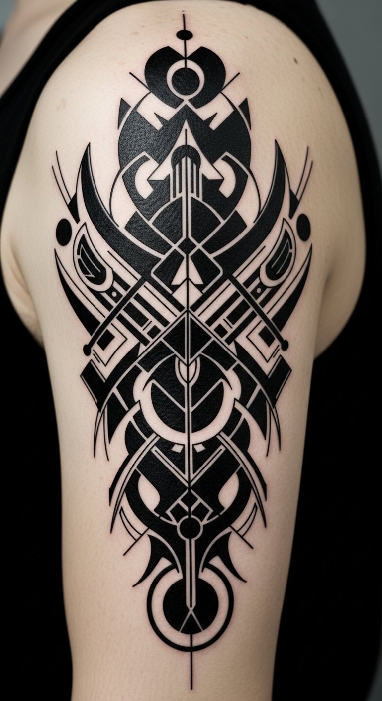 This design concept channels ancestral roots through bold, flowing lines and interwoven motifs that echo the original text’s emphasis on culture, history, and individual expression; place along the upper arm wrapping toward the shoulder or as a chest piece where the curves can follow musculature, evoking protection and movement, with focused blackwork and subtle negative-space highlights to communicate strength, continuity, and personal storytelling.