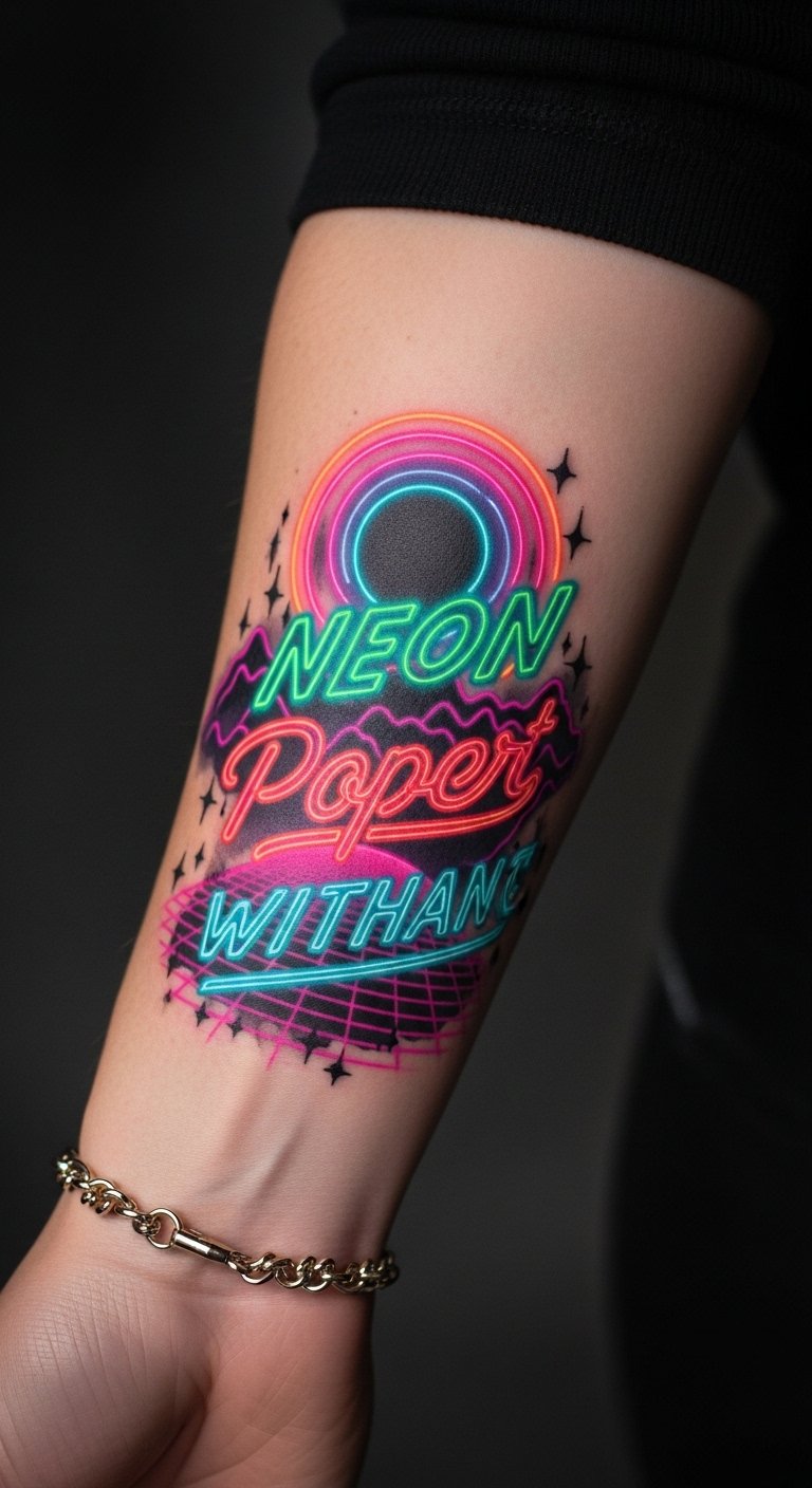 Ideal placements are the inner forearm or wrist for intimate visibility, the upper arm for bold presentation, or along the ribcage for a private, luminous statement; under low light the ink comes alive, making the wearer feel vibrant and unapologetically expressive.