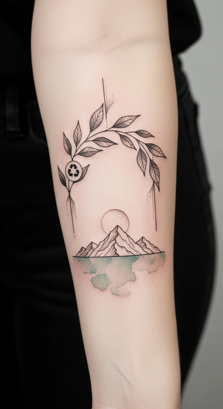 This design symbolizes growth, resilience, and stewardship—leaves for renewal and the mountain for strength and permanence—conveying a quiet but determined commitment to environmental advocacy; emotionally it evokes calm resolve and rooted purpose, ideal for placement along the inner forearm where the curved branch follows the arm’s natural line and remains visible for personal reminder yet easily covered when needed.
