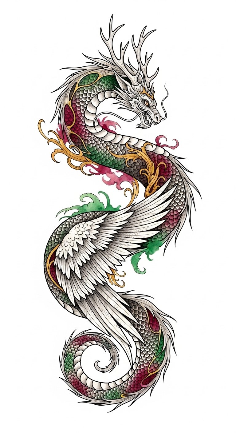 This design melds dragon power and wisdom with hybrid motifs—serpent sinuosity for adaptability, stag antlers for nobility and renewal, and avian feathers for freedom—evoking strength tempered by grace. Emotionally it communicates fierce self-possession and a liberated spirit, while the S-curve and filigree create movement and elegance. Recommended placement: forearm wrap for visible personal statement or upper back as a larger, centered piece where the antler crown and wings can spread, allowing color washes and bold shading to enhance depth and silhouette.