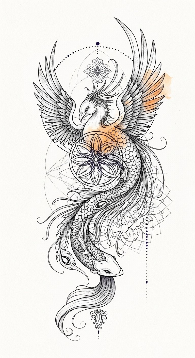 Embrace these designs to ignite your own transformative path. This design marries rebirth (phoenix) and perseverance (koi) with the seed of life and mandala to symbolize cycles, unity, and personal transformation. Emotionally it evokes hope, resilience, and calm transcendence; fine-dot shading and watercolor accents give it lyrical movement.