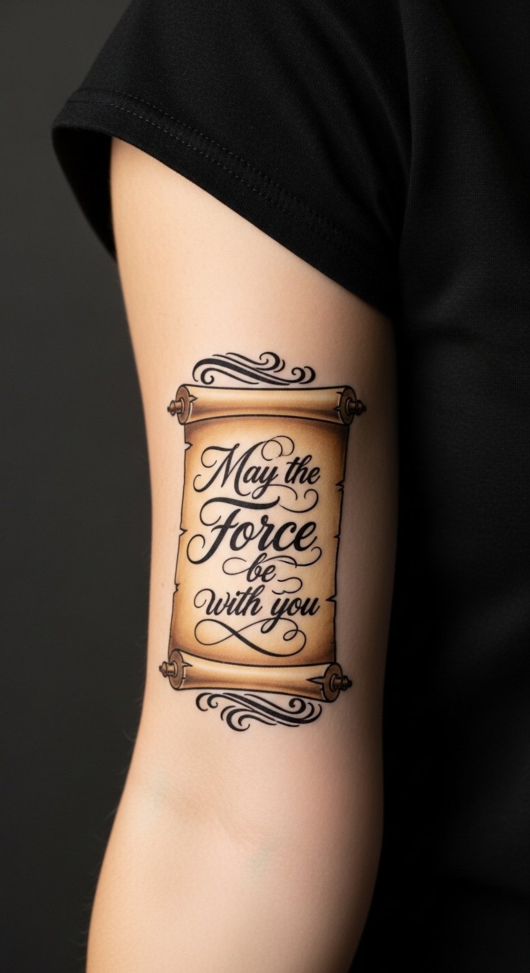 A forearm sleeve combining a realistic portrait of your favorite character fading into a cinematic scene framed by iconic symbols and a short powerful quote in script; bold blacks with selective color accents (red, gold), cinematic lighting, high contrast, fine line details, slight grain for a film-like texture — ideal for 6–8 inches vertical composition.