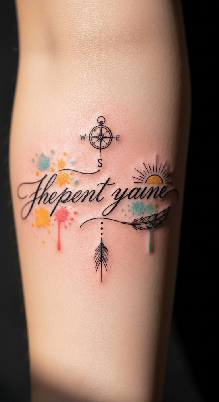 The watercolor washes evoke emotion and movement, the compass suggests direction, the feather represents lightness and courage, and the rising sun symbolizes renewal; together they create a personal talisman on the inner forearm—visible for reflection, intimate yet public, chosen to uplift during daily gestures and close encounters.