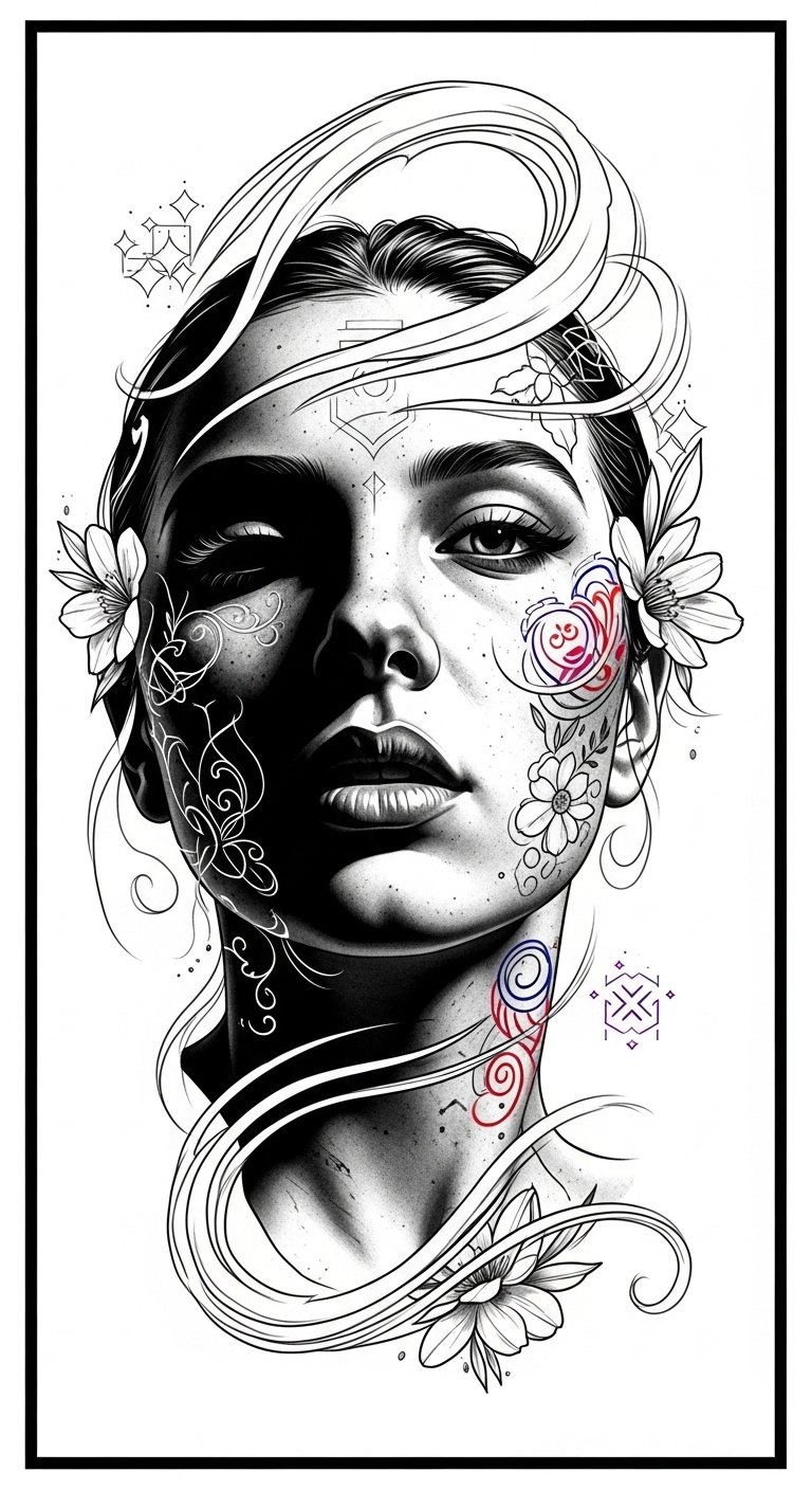 With every glance, you’ll feel empowered, embracing your truth in vibrant ink. This design uses contrast between shadow and light to symbolize resilience and vulnerability; the flowing brushstroke patterns and cultural motifs honor ancestry and personal narrative while selective color accents highlight moments of meaning.