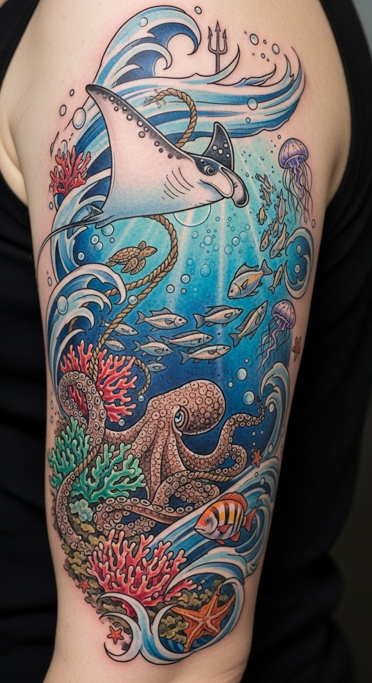 This design symbolizes a deep connection to the ocean, blending the beauty of marine life with elements of myth and navigation to express protection, adaptability, and a free spirit; emotionally it evokes tranquility, wonder, and reverence for nature, while the flowing composition suits placements that follow the body’s curves — forearm sleeve for continuous movement, upper back for a larger scene, or calf for a vertical journey.
