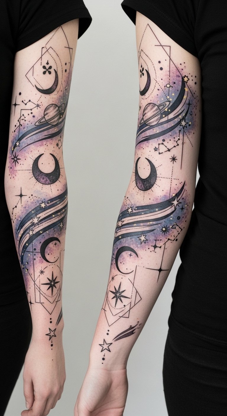 Let these designs inspire you to express your connection to the universe, igniting your creativity like never before. This design symbolizes boundless curiosity and personal growth, evoking wonder and a calm, expansive emotion; ideal placement is a flowing half-sleeve that wraps the upper arm and arcs toward the wrist so the shooting star points along the hand, allowing both large cosmic scenes and intimate constellations to read clearly with movement.