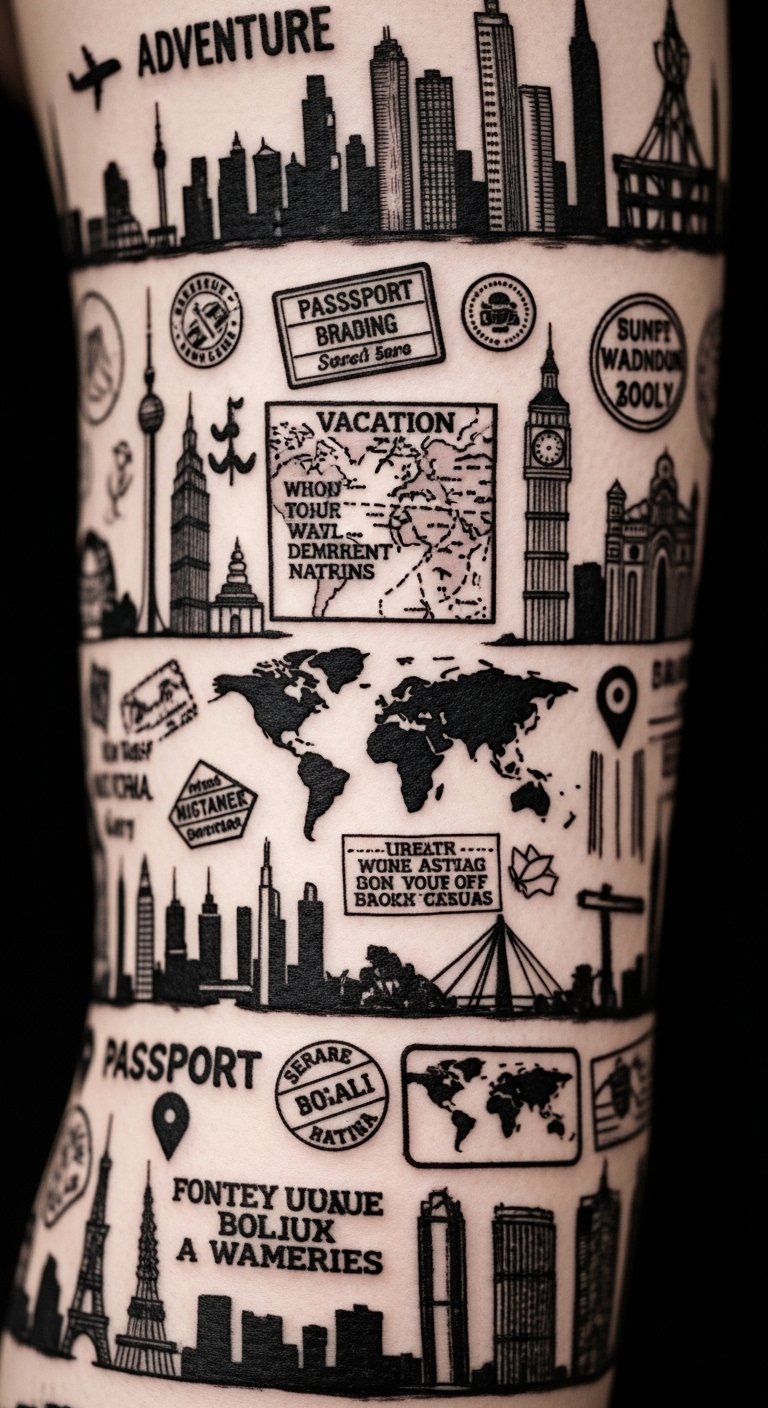 A compact tattoo design combining a skyline silhouette ribboned around a wrist or ankle, layered with a small passport-stamp circle, a fragment of an antique world map, and a subtle script of an adventure quote; use fine-line black ink with selective watercolor accents to highlight cultural symbols tied to each destination. Symbolically this piece weaves identity and memory—landmarks anchor personal history, stamps mark milestones, maps suggest ongoing journeys, and the quote fuels longing—evoking nostalgia, pride, and persistent curiosity. Ideal placement: inner forearm, behind the ear, or along the side rib for a personal, intimate reminder of travel and aspiration.
