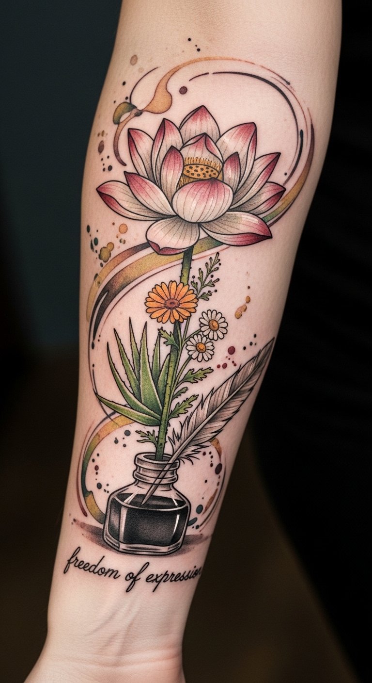 With the right care, you can celebrate your freedom through your art, keeping your tattoos alive and stunning. The design symbolizes protection and nourishment—water as cleansing, botanicals as healing—evoking calm confidence and reverence for personal expression; placed as a forearm sleeve it follows muscle and bone flow, allowing each botanical element to accent existing tattoos and enhance vibrancy while suggesting ongoing care and celebration.