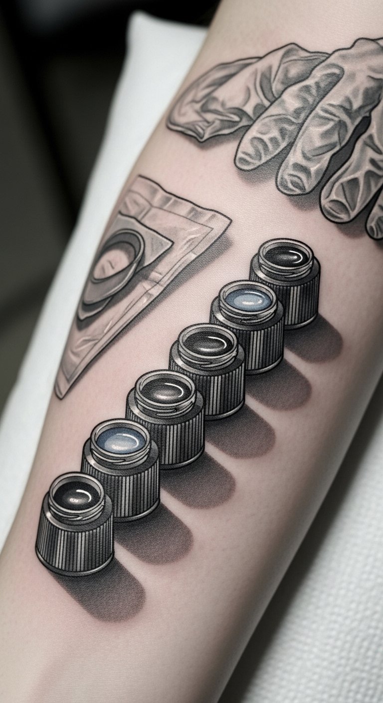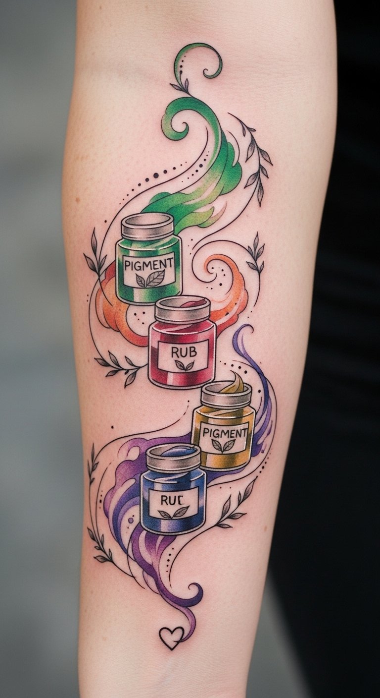 A tattoo concept that translates this text into imagery: a forearm sleeve featuring a row of stylized, translucent ink bottles with sterile caps, each cap opening to release a ribbon of vibrant color that morphs into tools of the trade—needles, stencils, brushes—and organic motifs like ivy and geometric shards. The sterile caps are rendered as gleaming, precise metallic forms to emphasize hygiene and control, while the colors are saturated and slightly iridescent to evoke creativity and innovation. Symbolically, the bottles represent the artist’s curated skills and disciplined practice; the flowing ribbons of color signify inspiration and the seamless transition from idea to art. Emotionally, the piece balances clinical precision with joyful expression—confidence, clarity, and creative freedom. Ideal placement is along the outer forearm or calf where the linear arrangement can follow the limb’s length, allowing visibility and interaction during tattooing sessions.
