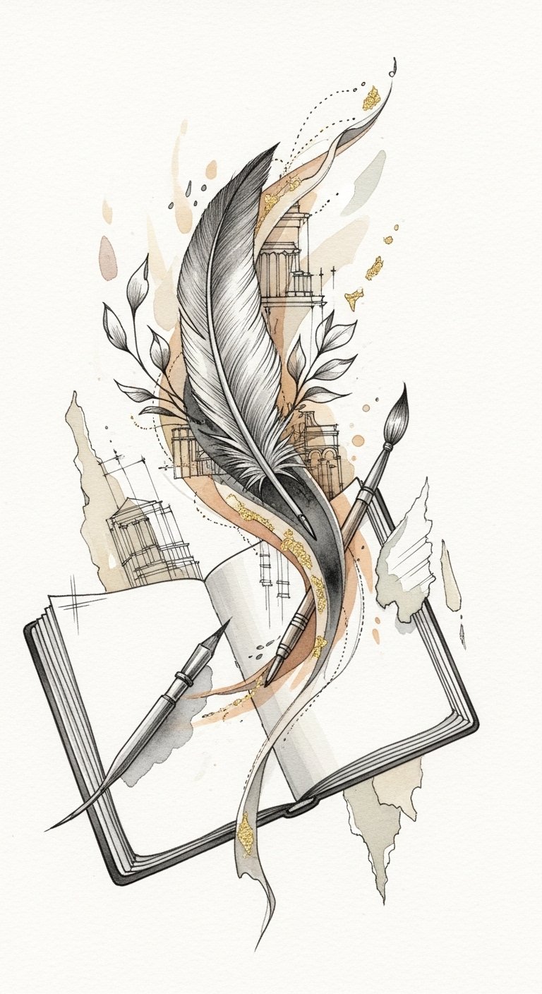 This tattoo concept blends tools of creativity and organic growth to symbolize artistic freedom and continual evolution; the quill-to-brush transition represents versatility, the floral vines signify ideas taking root and blooming, and the architectural lines echo structure and discipline.