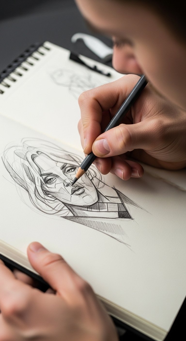 A tattoo design centered on an open sketchbook, graphite pencils fanning outward with varying tips and pressure marks, rendered in realistic grey and black tones to showcase smooth application and rich pigment; surrounding the sketchbook are faint, flowing lines and subtle smudges that suggest movement and evolving ideas, with areas of deep shading to create depth and detail; ideal placement along the forearm or upper back where the composition can follow the natural lines of the body, symbolizing artistic freedom, creative exploration, and the passion behind meaningful designs—evoking emotion of deliberate craftsmanship and personal expression.