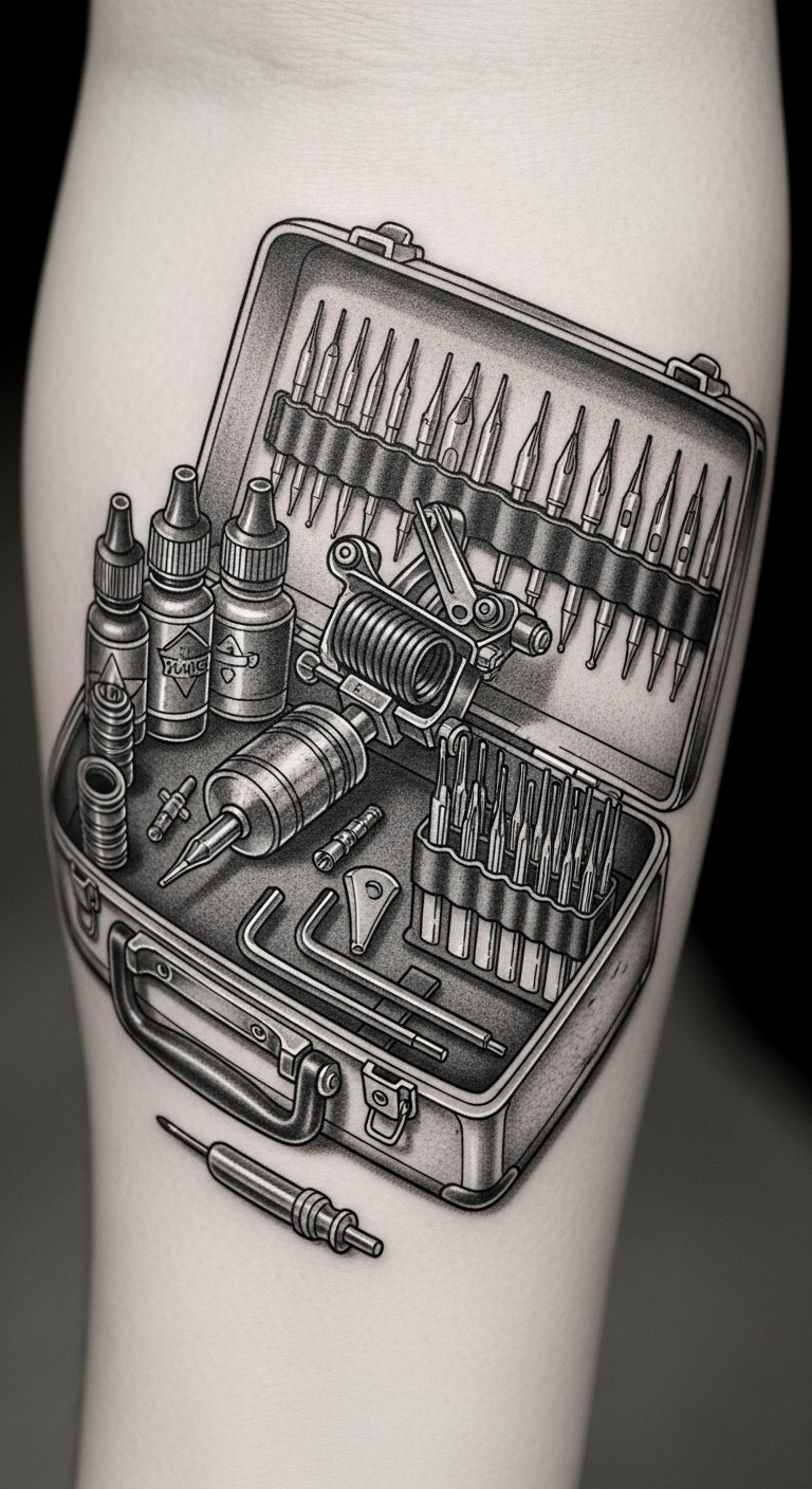 The composition symbolizes the beginning of an artist’s journey, merging the technical reliability of tools with the intimate craft of tattooing; the vintage toolbox suggests tradition and respect for the trade.