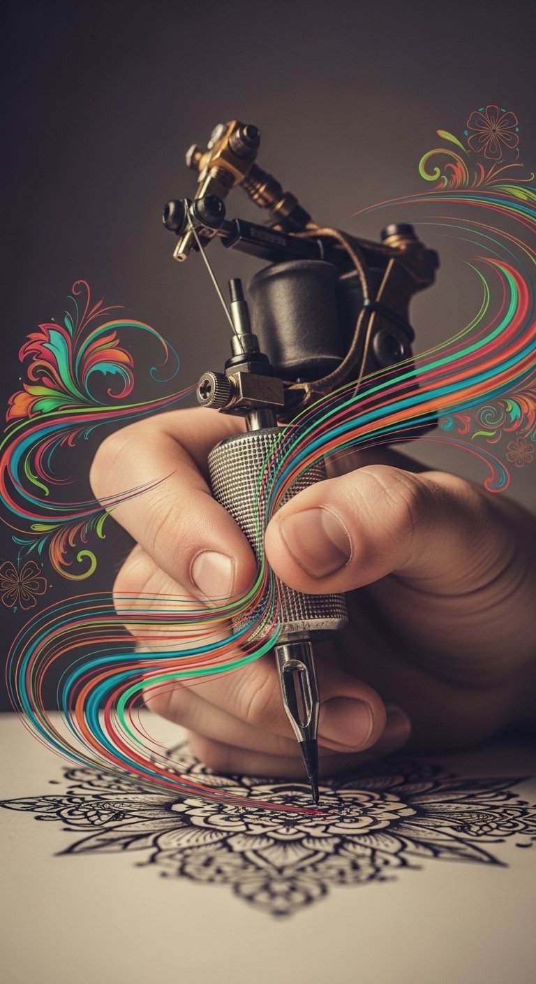 A flowing sleeve or back piece that integrates a stylized hand holding a glowing digital stylus, surrounded by abstract ribbons of color that morph into ink splatters and delicate linework; incorporate small icons of virtual sketching panels and subtle circuit-like patterns weaving into organic floral elements, with gradients suggesting light from a screen. Symbolically this tattoo merges tradition and technology—celebrating creative freedom, experimentation, and the bridge between tactile ink and virtual tools. It evokes curiosity, empowerment, and an ongoing evolution of artistic identity; ideal placement is the forearm to wrist for visibility and movement, or a large back/shoulder canvas to allow the ribbons and panels room to flow and transform.
